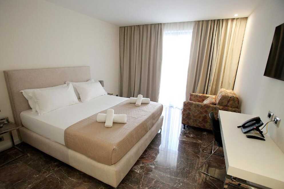 Tweepersoonskamer met balkon Een tweepersoonsbed of twee eenpersoonsbedden. Wifi, airconditioning en kluisje inbegrepen. Tv. Föhn. Badkamer met bad/douche en toilet. Schoonmaak 7 keer/week.