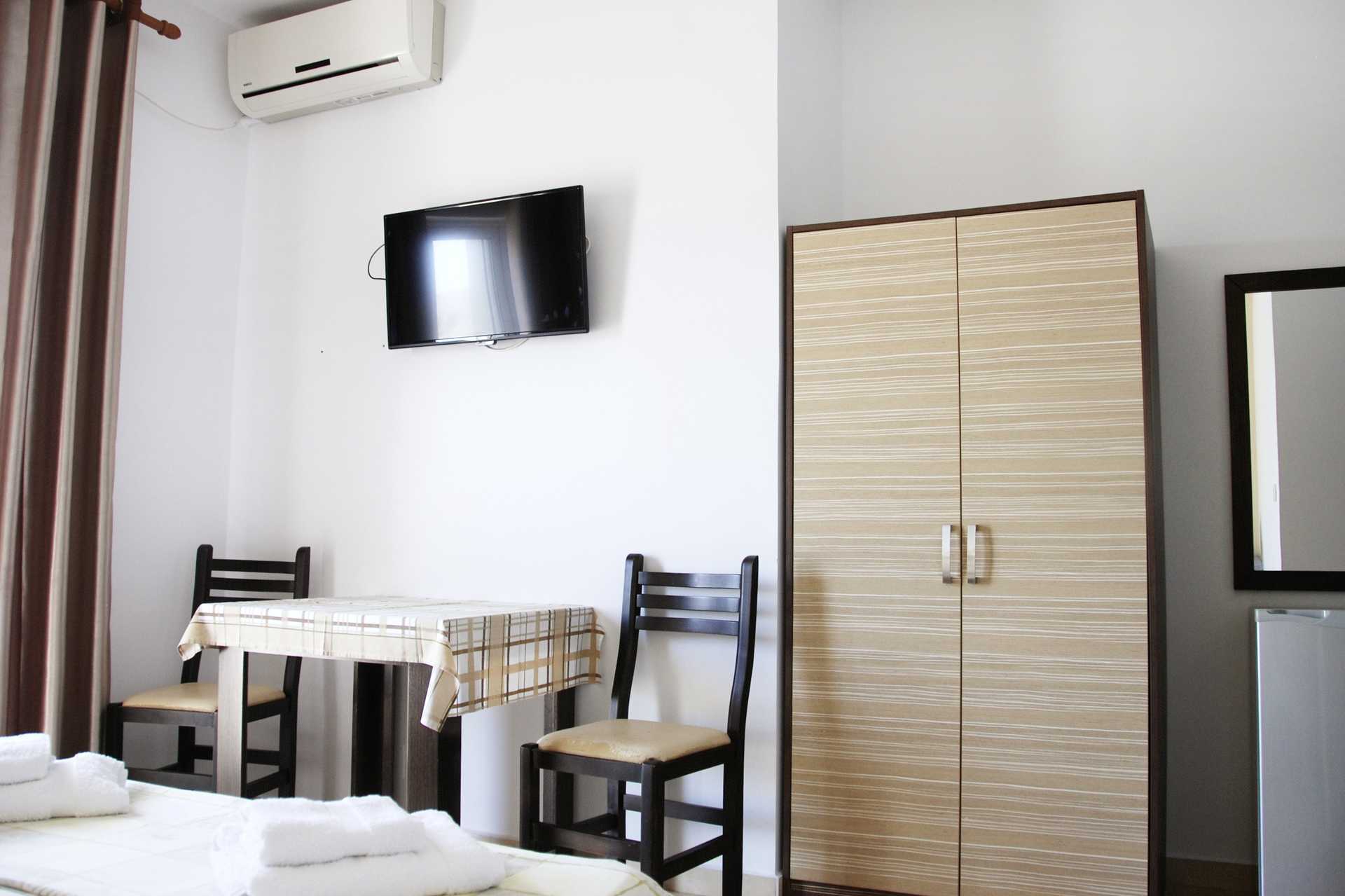 Familiekamer met drie gewone bedden en balkon. Wifi, airconditioning en kluisje inbegrepen. Koelkast. Tv met internationale zenders. Föhn. Badkamer met bad of douche en toilet. Schoonmaak 7 keer/week.