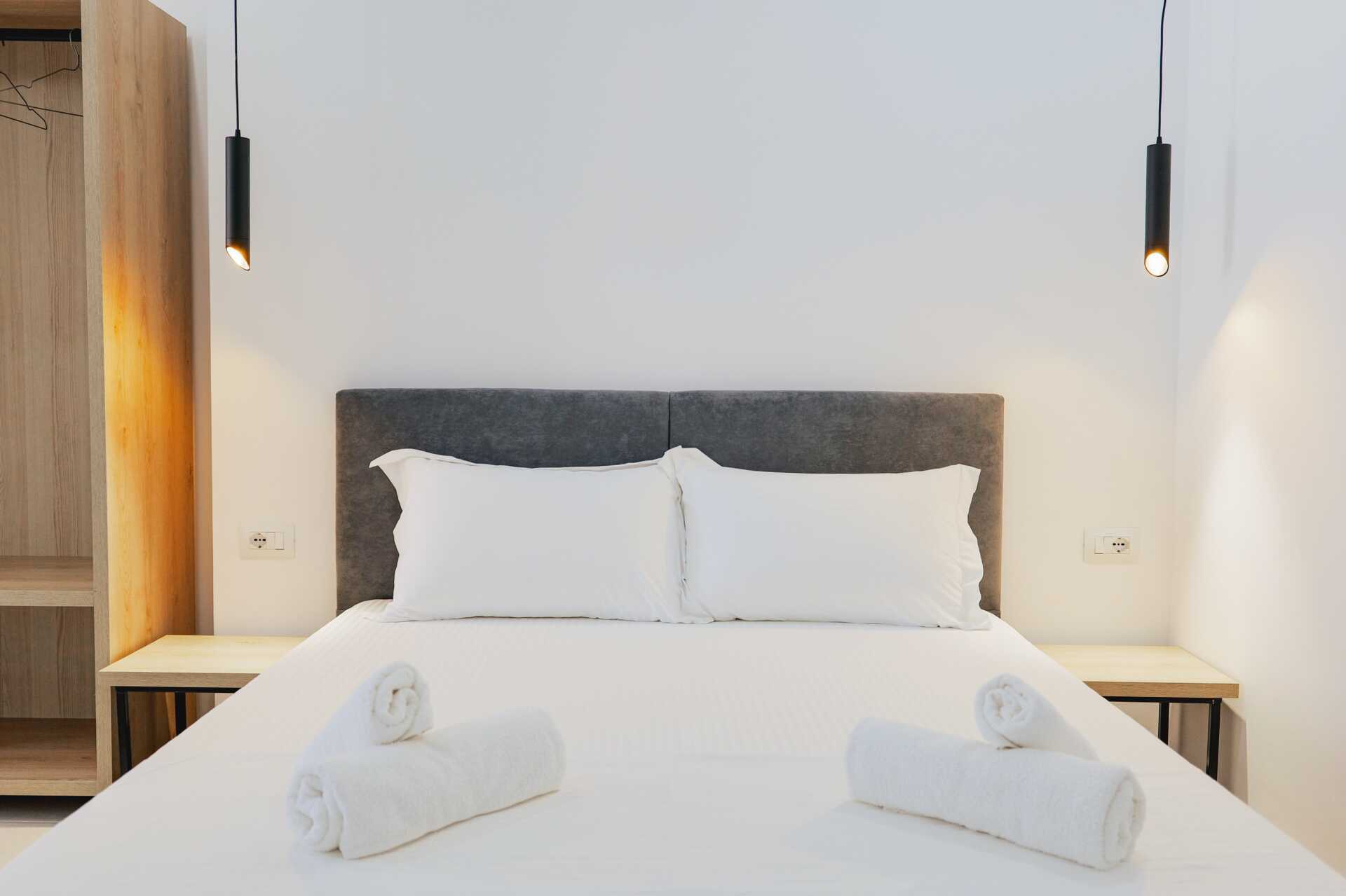 Tweepersoonskamer met balkon en uitzicht op zee. Wifi, airconditioning en kluisje inbegrepen. Koelkast. Tv met internationale zenders. Föhn. Badkamer met bad of douche en toilet. Schoonmaak 7 keer/week.