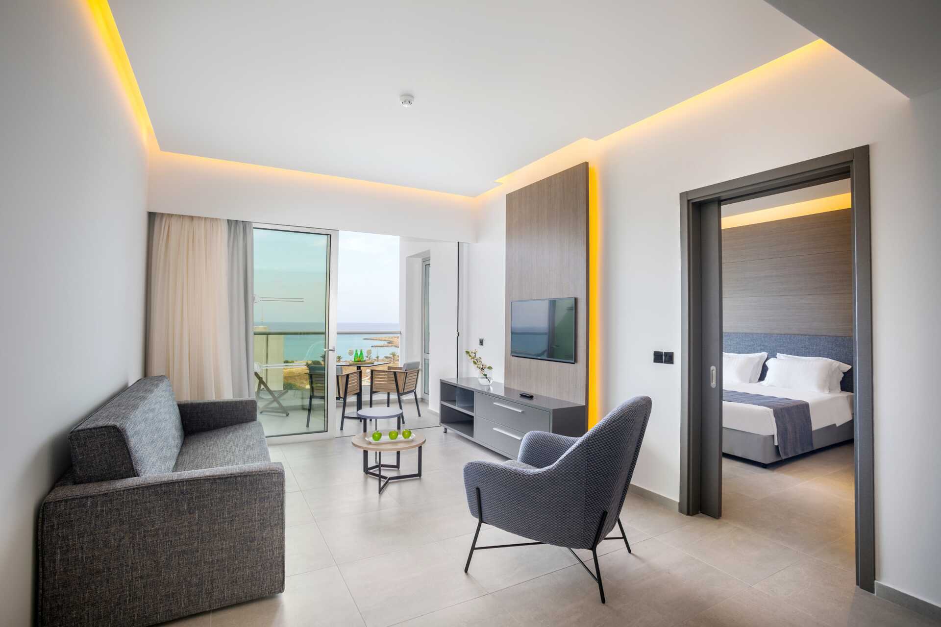 Executive kamer met balkon en beperkt zeezicht. De kamer bestaat uit een woonkamer met een slaapbank en een slaapkamer met een tweepersoonsbed of twee eenpersoonsbedden. Wifi, airconditioning en een kluisje zijn inbegrepen. Minibar tegen betaling. Waterkoker en koffie en thee. Nespresso-apparaat. Tv met internationale zenders. Badjassen en hotelslippers. Föhn. Twee badkamers, één met douche en toilet en één met bad en toilet. Schoonmaak 7 keer/week. Kinderen onder de twee jaar zijn inbegrepen in het maximum aantal personen op de kamer.