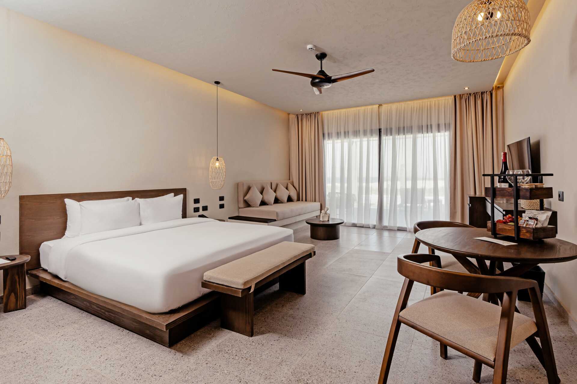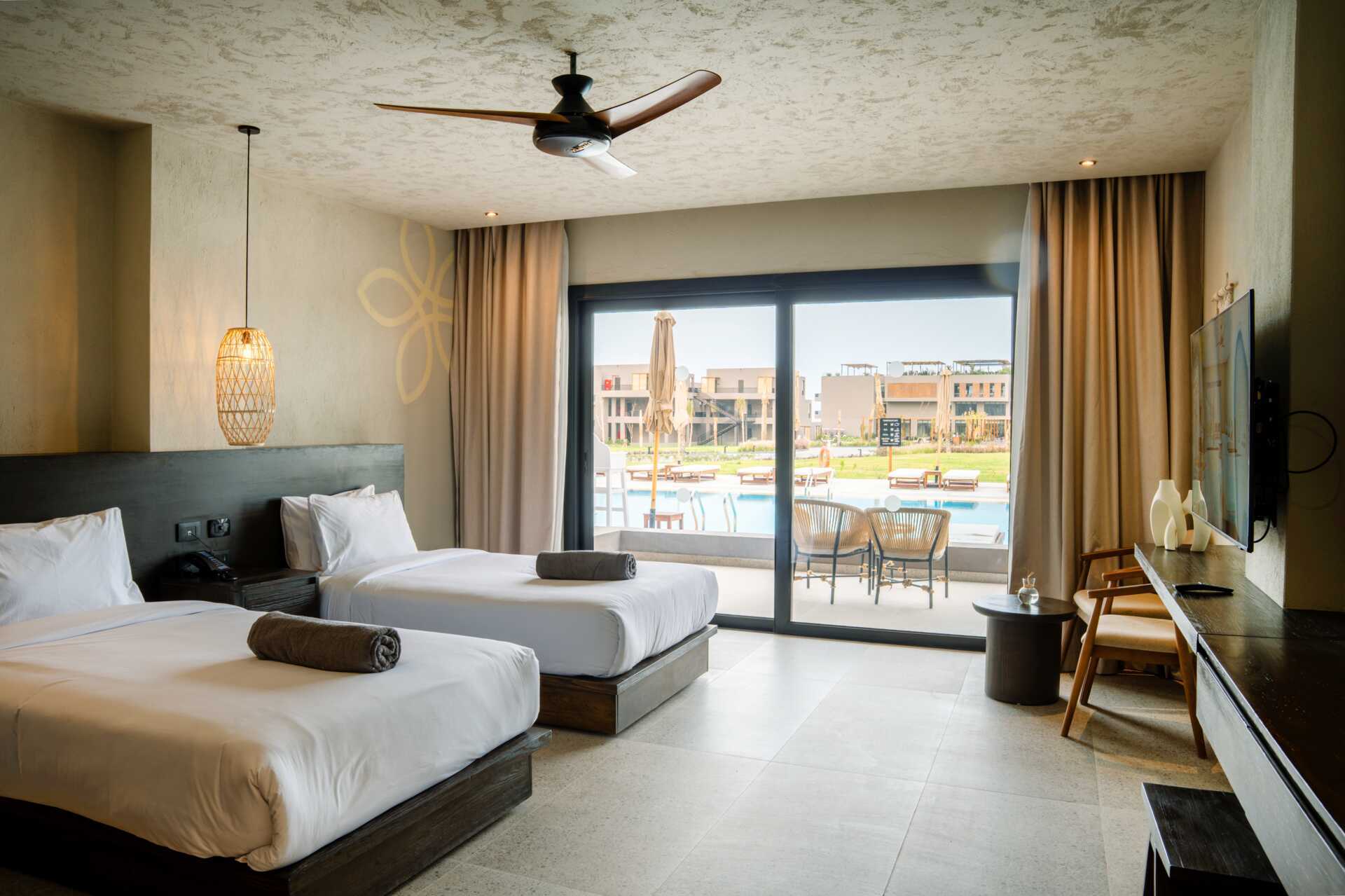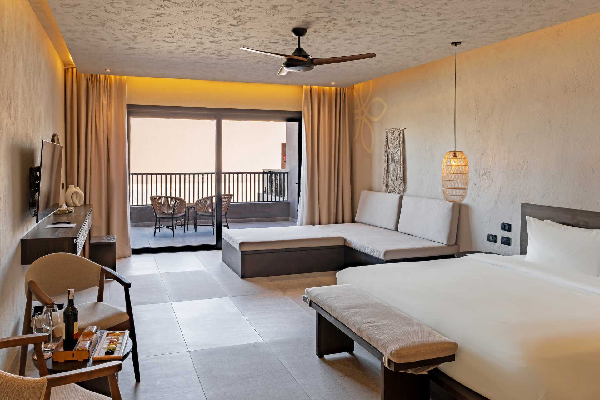 Suite met terras op de begane grond en zeezicht. Een tweepersoonsbed of twee eenpersoonsbedden. Mogelijkheid tot extra bedden in de vorm van een slaapbank. Wifi, airconditioning en kluisje inbegrepen. Minibar tegen betaling. Waterkoker, koffie en thee. Tv met internationale zenders. Föhn. Badkamer met douche en toilet. Schoonmaak 7 keer per week.