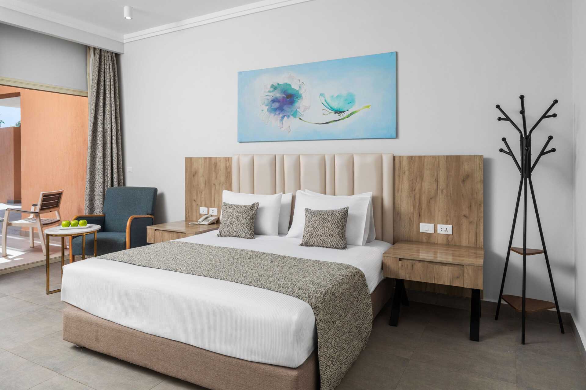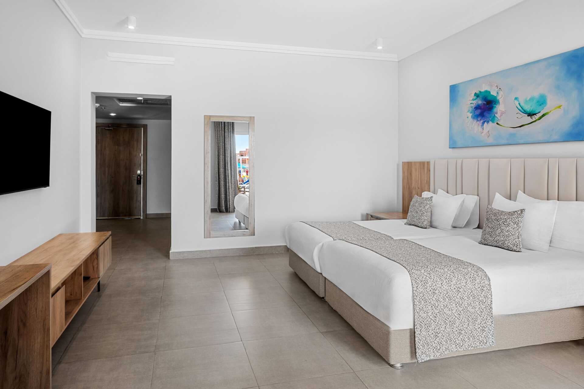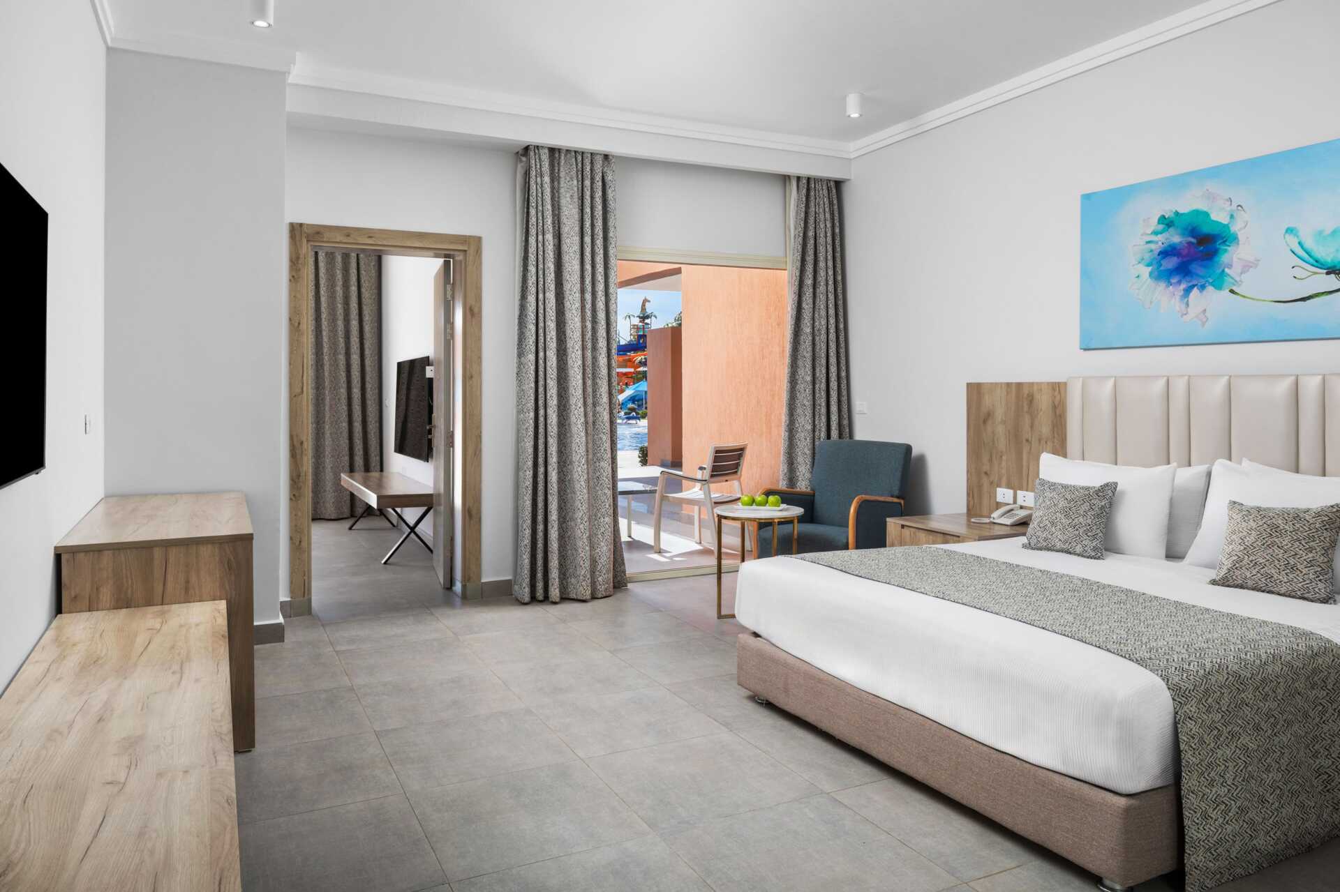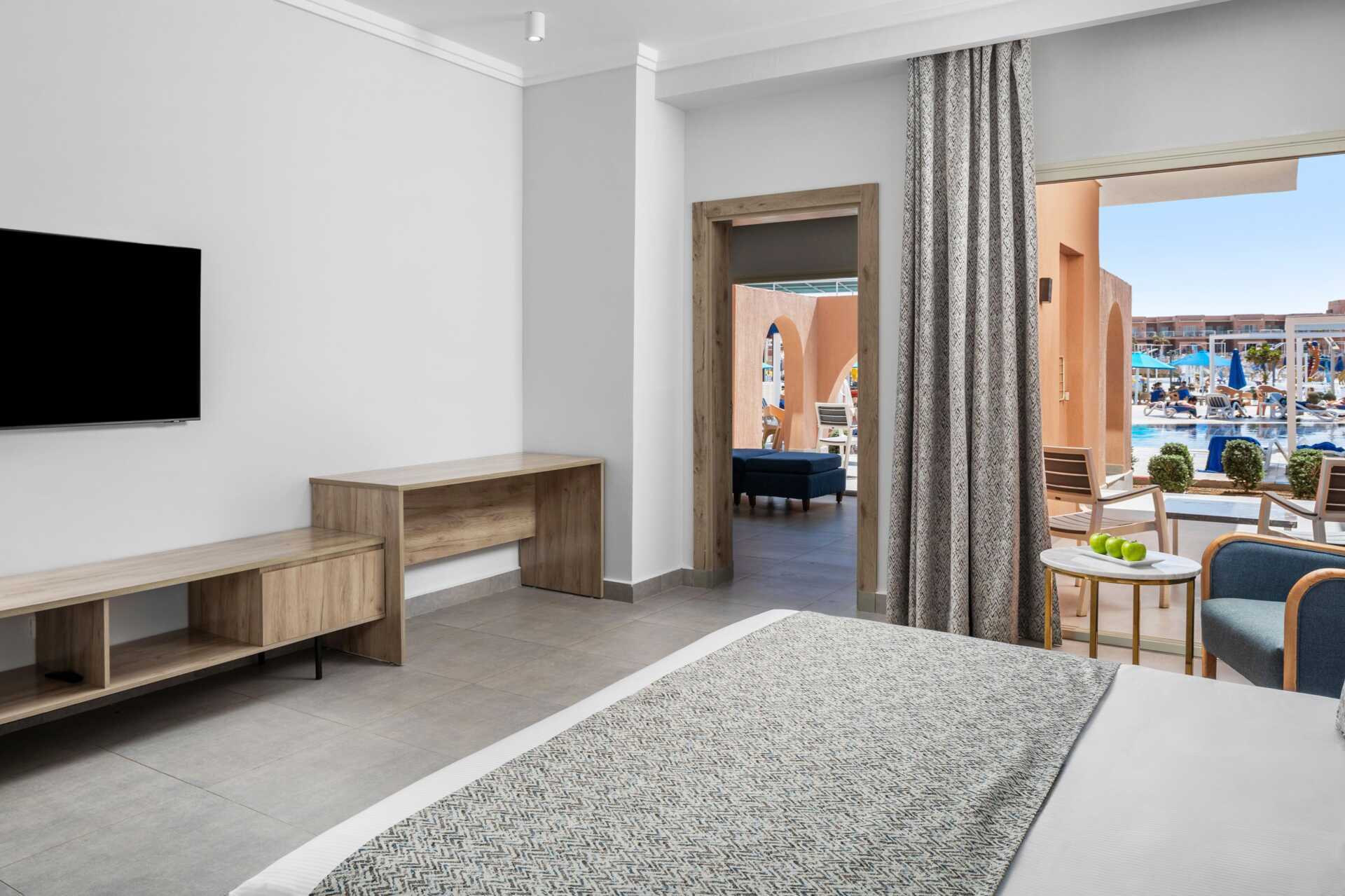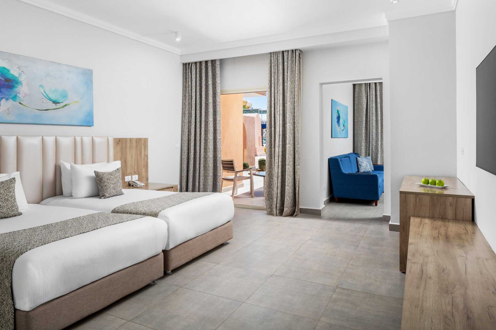 Tweekamersuite met balkon of terras en uitzicht op het zwembad. De suite bestaat uit twee slaapkamers met elk een eigen badkamer in de gedeelde hal. Eén van de slaapkamers beschikt over een woonkamer. In de ene slaapkamer staat een tweepersoonsbed, en in de tweede slaapkamer staan twee eenpersoonsbedden. Mogelijkheid voor een extra bed in een eenpersoonsbed. Wifi, airconditioning en kluisje inbegrepen. Minibar tegen betaling - dagelijkse bijvulling van flessenwater inbegrepen. Tv met internationale zenders. Föhn. Badkamer met bad of douche en toilet. Schoonmaak 7 keer/week.