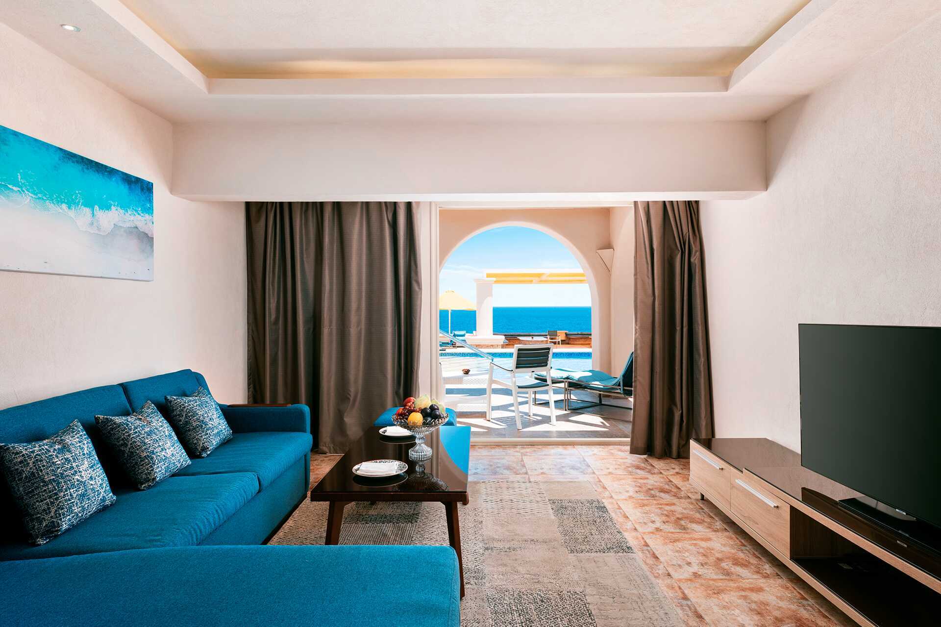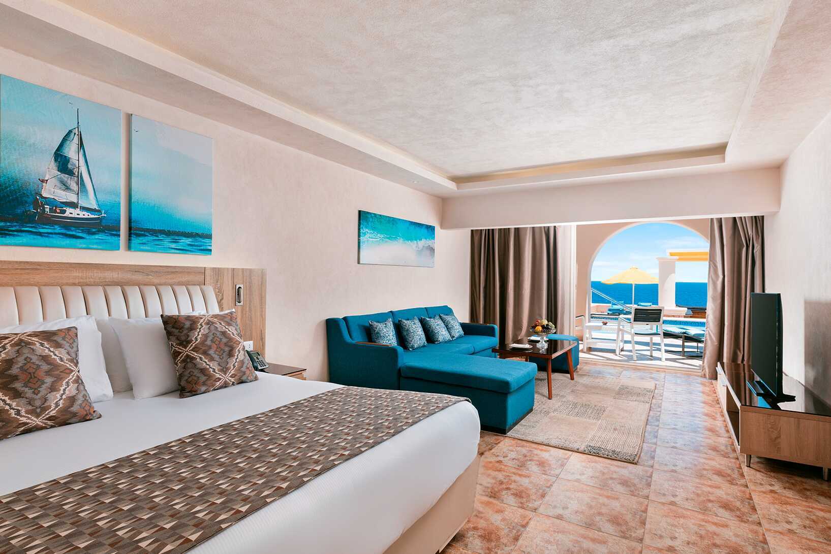 Superior kamer met terras, gedeeld zwembad en uitzicht op zee. Op het terras staan ligstoelen, tafels en stoelen. De kamers zien er iets anders uit, afhankelijk van in welk gebouw je verblijft. Een tweepersoonsbed of twee eenpersoonsbedden. Mogelijkheid voor een extra bed in een slaapbank. Airconditioning, wifi en kluis inbegrepen. Minibar tegen betaling. Waterkoker, koffie en thee. Föhn. Badkamer met douche en toilet. Schoonmaak 7 keer / week. Gasten moeten 13 jaar of ouder zijn om in dit kamertype te verblijven.