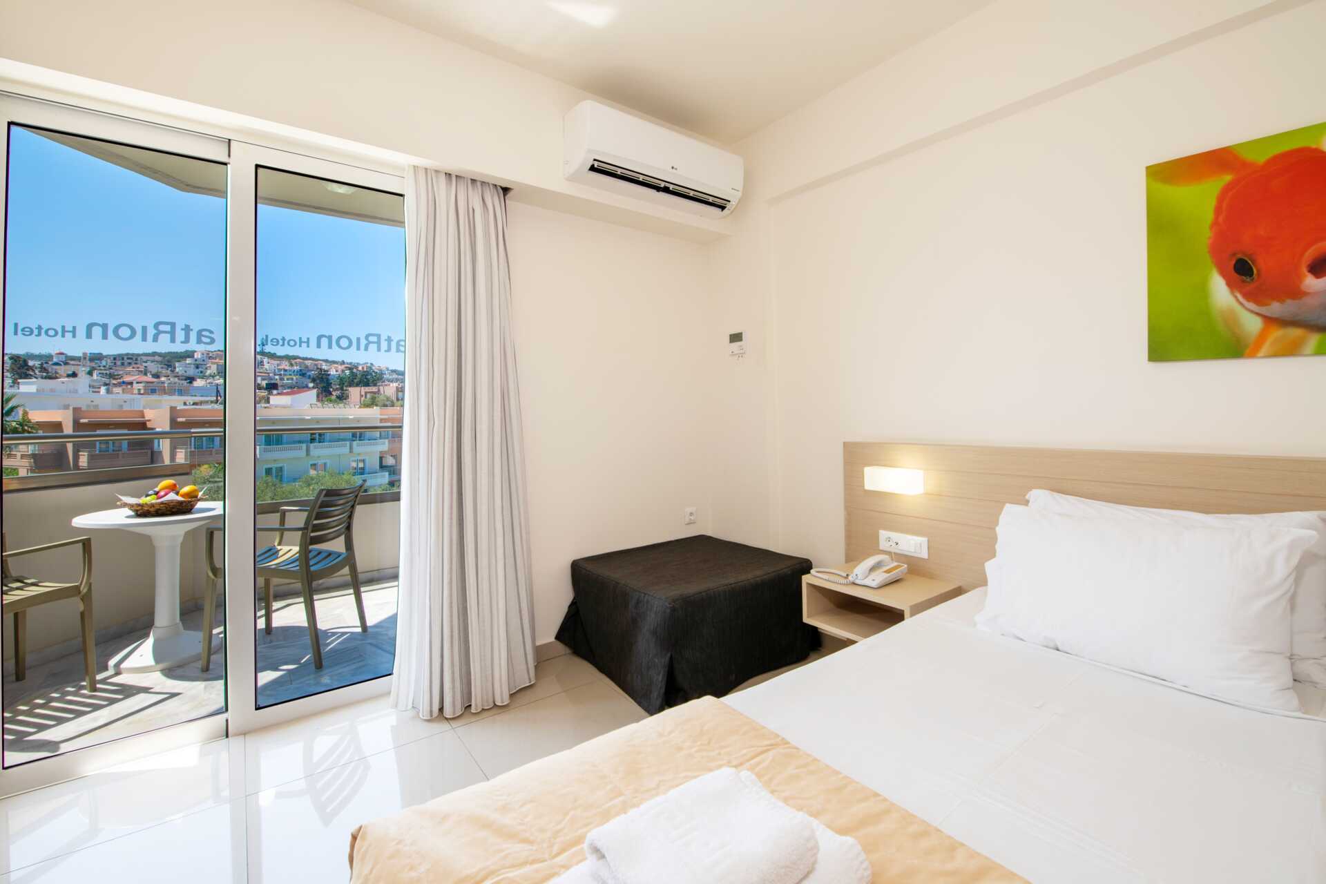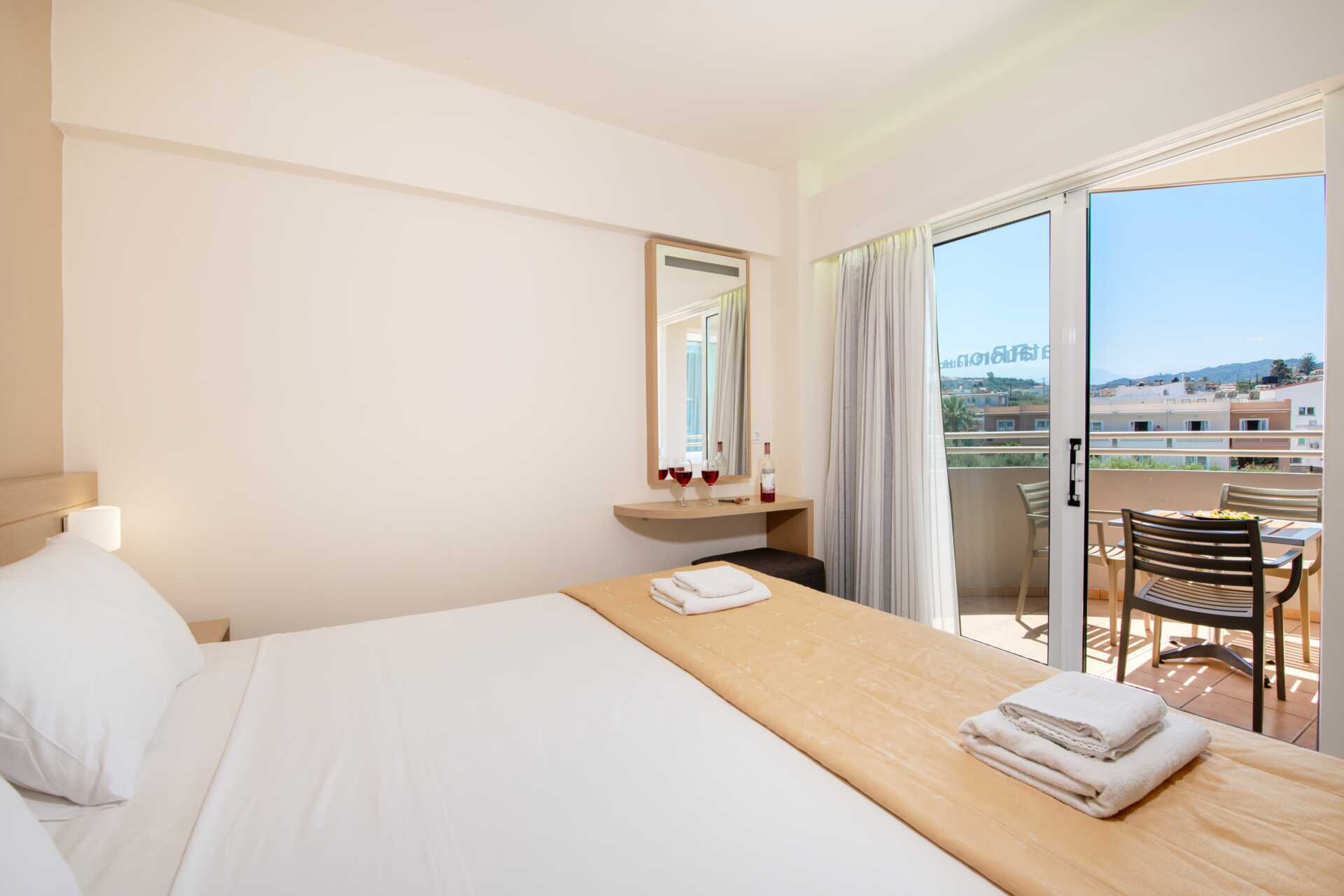 Driekamerappartement met balkon of balkon op de grond. Twee slaapkamers en een gecombineerde woonkamer met minikeuken. In sommige driekamerappartementen is een slaapkamer klein. Een tweepersoonsbed of twee eenpersoonsbedden in elke slaapkamer. Mogelijkheid voor extra bedden in een slaapbank of in eenpersoonsbedden. Als alle extra bedden worden gebruikt, wordt het appartement overvol. Minikeuken met kookplaten, waterkoker, koelkast, magnetron, koffiezetapparaat en basiskeukengerei. Wifi, airconditioning en kluisje inbegrepen. Tv met internationale zenders. Föhn. Badkamer met douche en toilet. Schoonmaak 6 keer / week.