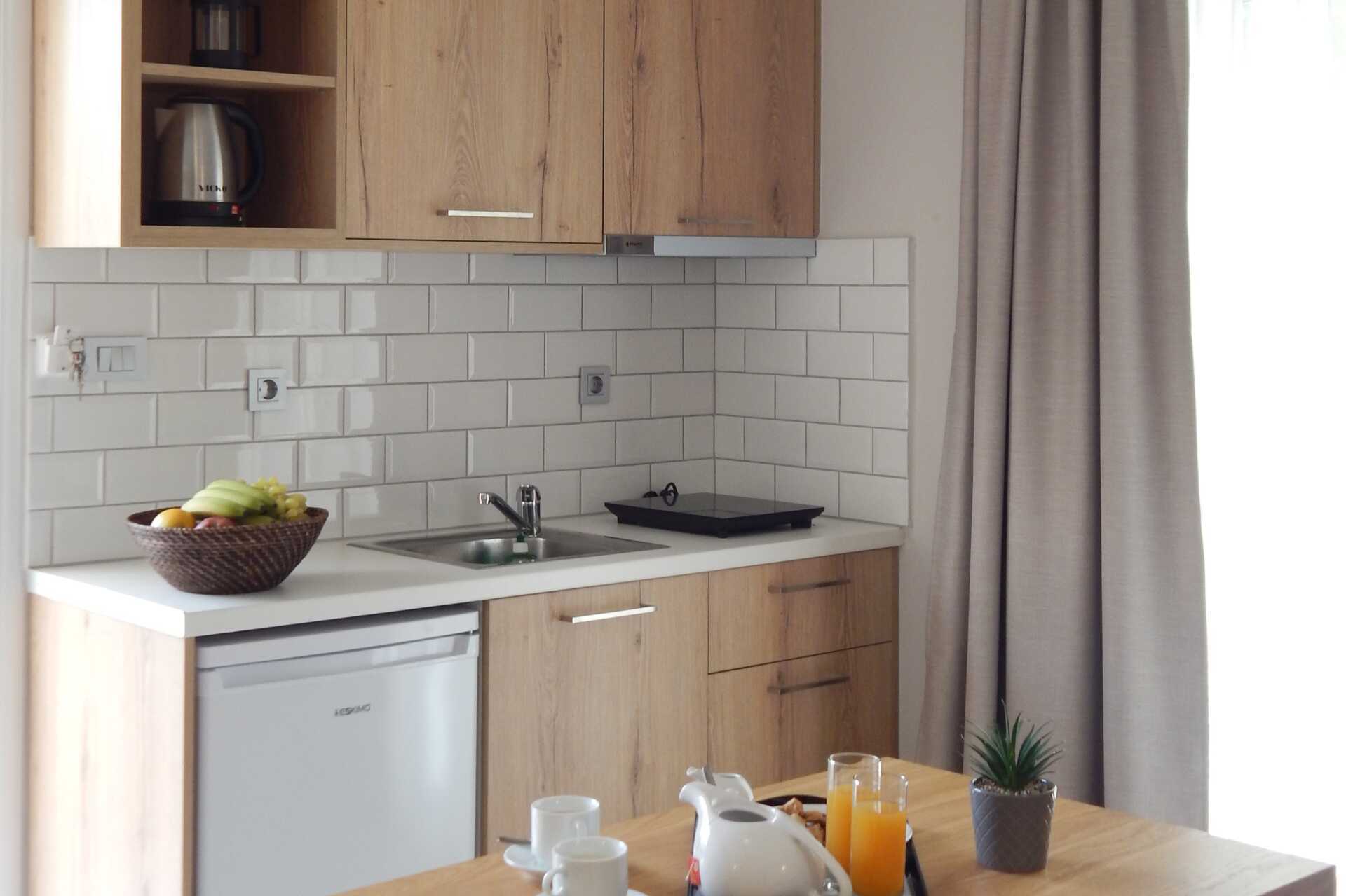Tweekamerappartement met balkon of grondbalkon. Slaapkamer en gecombineerde woonkamer met kitchenette. Een tweepersoonsbed of twee eenpersoonsbedden. Mogelijkheid voor extra bedden in slaapbank. Minikeuken met kookplaten, koelkast met vriesvak, waterkoker, koffiepers en eenvoudige keukenapparatuur. Wifi en airconditioning inbegrepen. Kluisje tegen betaling. Föhn. Badkamer met douche en toilet. Schoonmaak 6 keer/week.