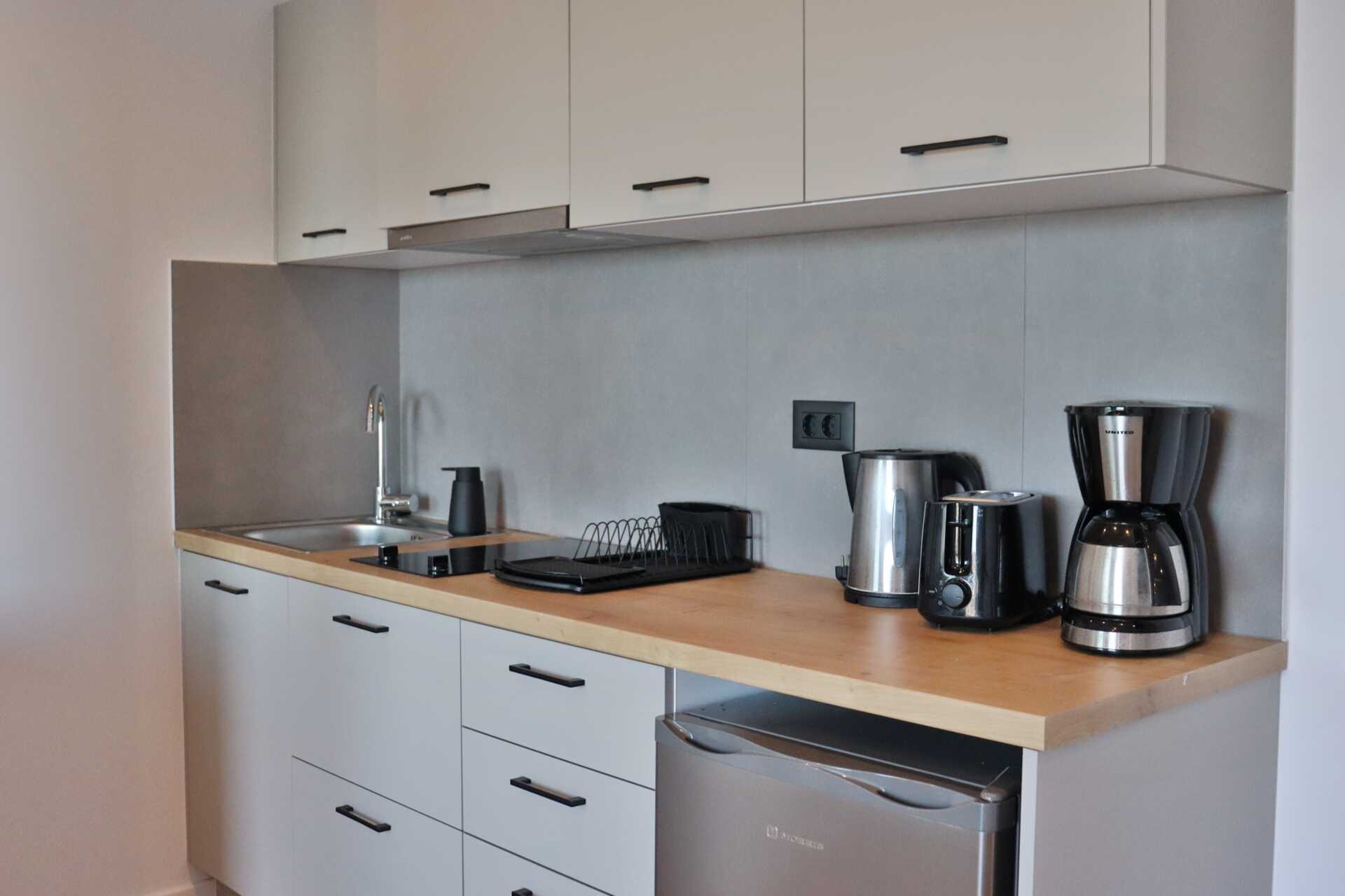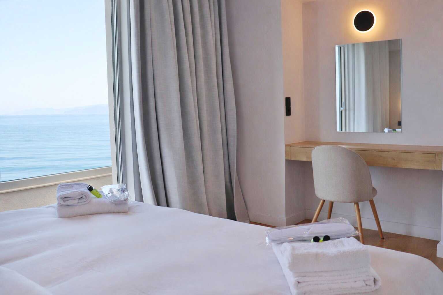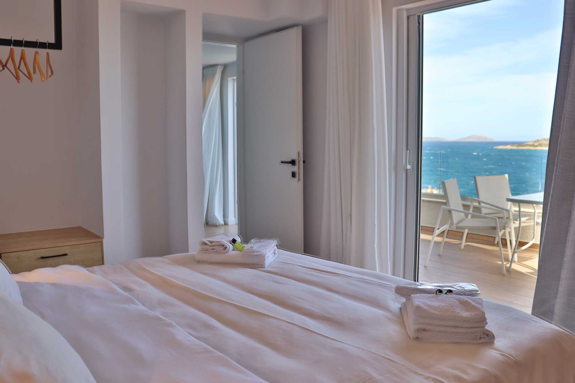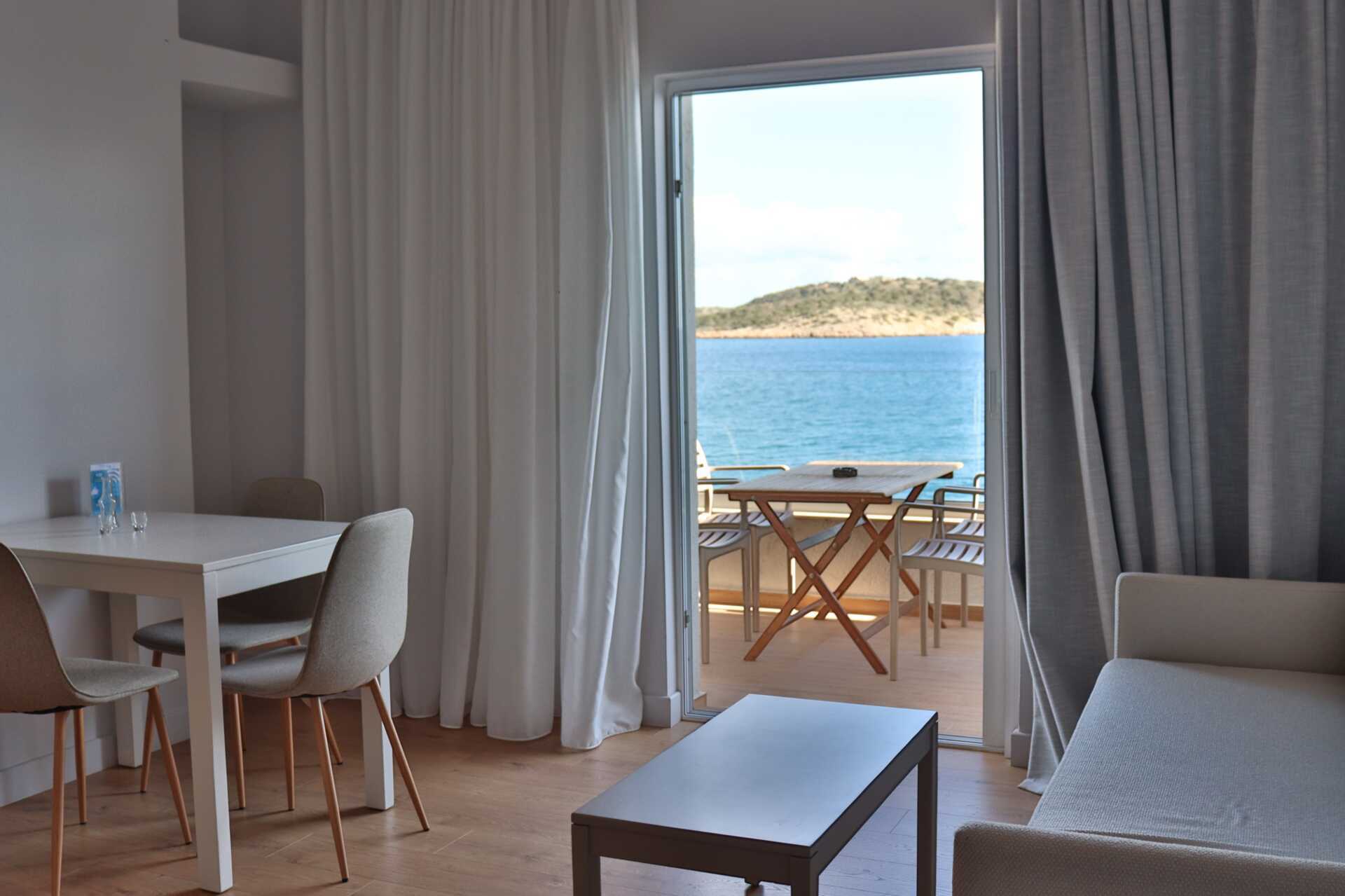 Tweekamerappartement met balkon en zeezicht - de grootte van de balkons kan sterk variëren, van een smal balkon waar twee stoelen en een smalle tafel passen tot een balkon met vier stoelen en een tafel. De specifieke grootte van het balkon kan niet worden gegarandeerd - of met een groot balkon of terras met zeezicht. Een slaapkamer en een gecombineerde woonkamer met kitchenette. Een tweepersoonsbed of twee eenpersoonsbedden. Mogelijkheid tot extra bed in de vorm van een slaapbank. Kitchenette met kookplaat, koelkast, waterkoker, koffiezetapparaat en basiskeukengerei. Wifi, airconditioning en kluisje inbegrepen. Televisie met lokale zender. Föhn. Badkamer met douche en toilet. Schoonmaak 6 keer/week.