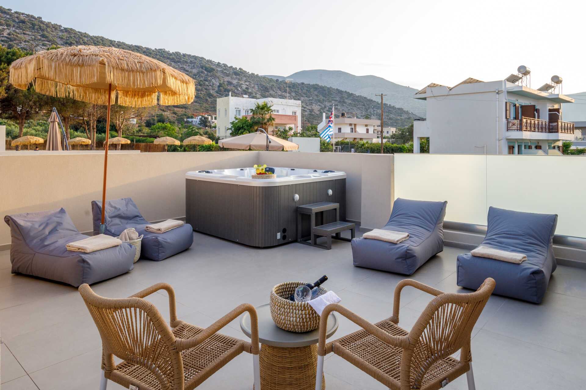 Junior suite met jacuzzi op het balkon. Op het balkon staan ligbedden en parasols, evenals stoelen en een tafel. Een tweepersoonsbed. Wifi, airconditioning en kluis inbegrepen. Koelkast. Espressomachine, capsules inbegrepen. Televisie met internationale zenders. Föhn Badkamer met douche en wc. Schoonmaak 7 keer/week.