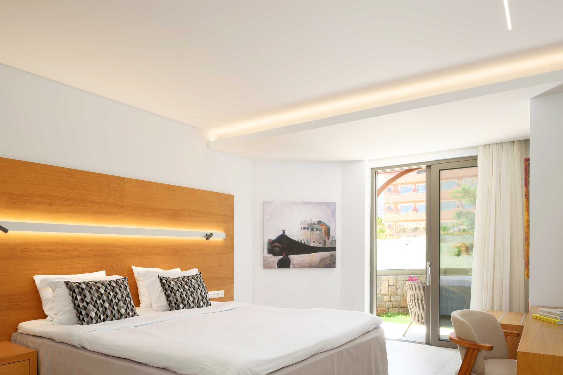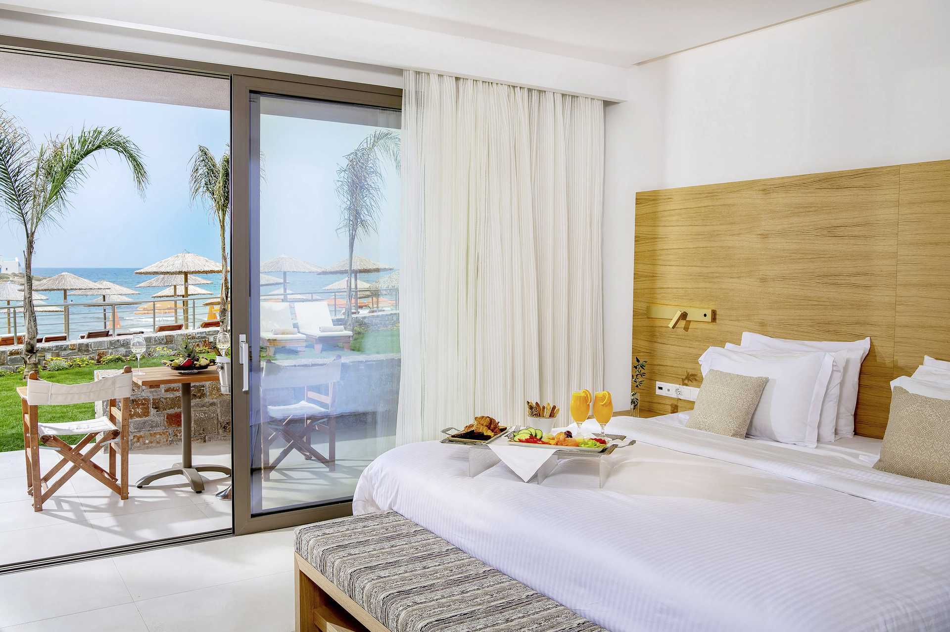 Deluxe suite met een patio en gedeeld zwembad. De suites hebben een open badkamer. Een tweepersoonsbed. Mogelijkheid voor extra bed in slaapbank. Kussenmenu. Wifi en airconditioning inbegrepen. Kluis tegen betaling. Koelkast, een fles water inbegrepen en dagelijks aangevuld. Waterkoker en koffie en thee. Nespresso-apparaat, capsules inbegrepen. Bij aankomst een fles Kretenzische wijn en frisdrank op de kamer. Tv met internationale zenders. Badjassen en pantoffels. Badkamer met bad, aparte douche en toilet. Schoonmaak 7 keer / week. Een parasol en twee ligstoelen zijn voor je gereserveerd op het strand.