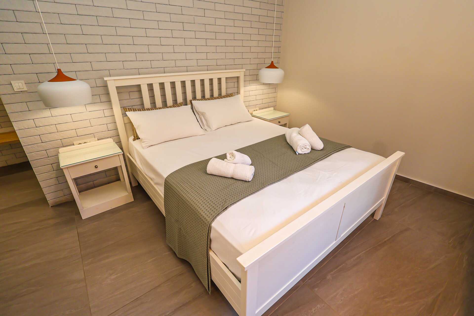 Driekamerappartement op de eerste verdieping met balkon. Twee slaapkamers met in elke slaapkamer een tweepersoonsbed of twee eenpersoonsbedden. Minikeuken met kookplaat, koelkast, waterkoker en eenvoudige keukenapparatuur. Wifi en airconditioning zijn inbegrepen. Kluisje tegen betaling. Badkamer met douche en toilet. Schoonmaak 6 keer/week.