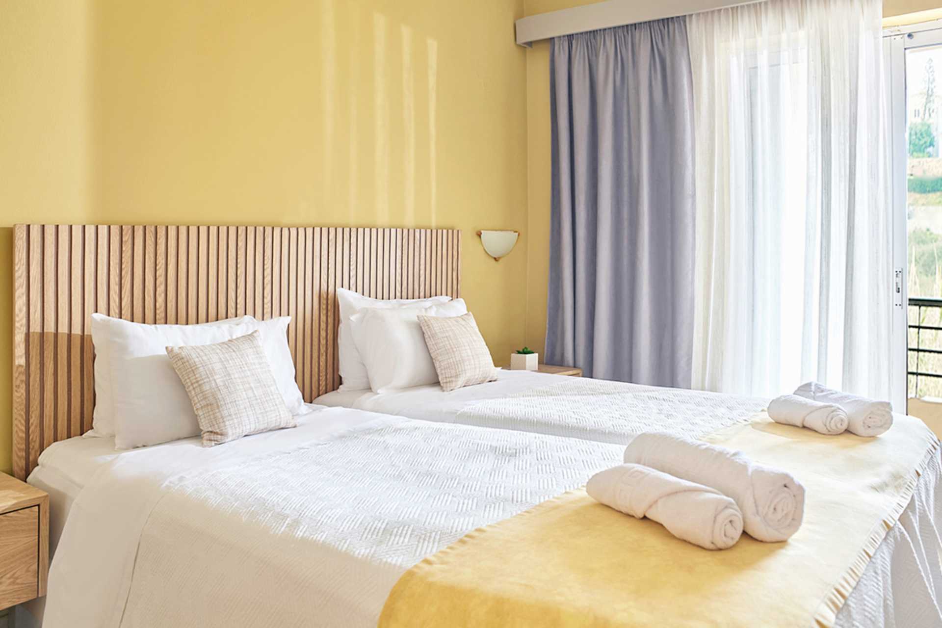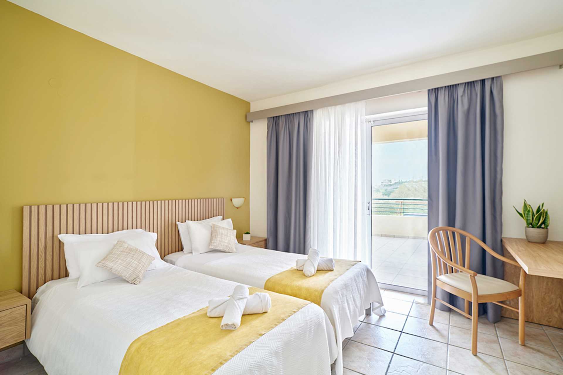 Tweekamerappartement met balkon of balkon op de begane grond, sommige met uitzicht op het zwembad. Slaapkamer en gecombineerde woonkamer met kitchenette. In sommige appartementen zijn er enkele niveauverschillen van enkele treden. Twee eenpersoonsbedden. Mogelijkheid voor extra bedden in slaapbank. Minikeuken met kookplaten, koelkast met vriesvak, magnetron, koffiezetapparaat, waterkoker, broodrooster en eenvoudige keukenapparatuur. Wifi, airconditioning en kluisje inbegrepen. Tv met internationale zenders. Föhn. Badkamer met bad of douche en toilet. Schoonmaak 6 keer/week.