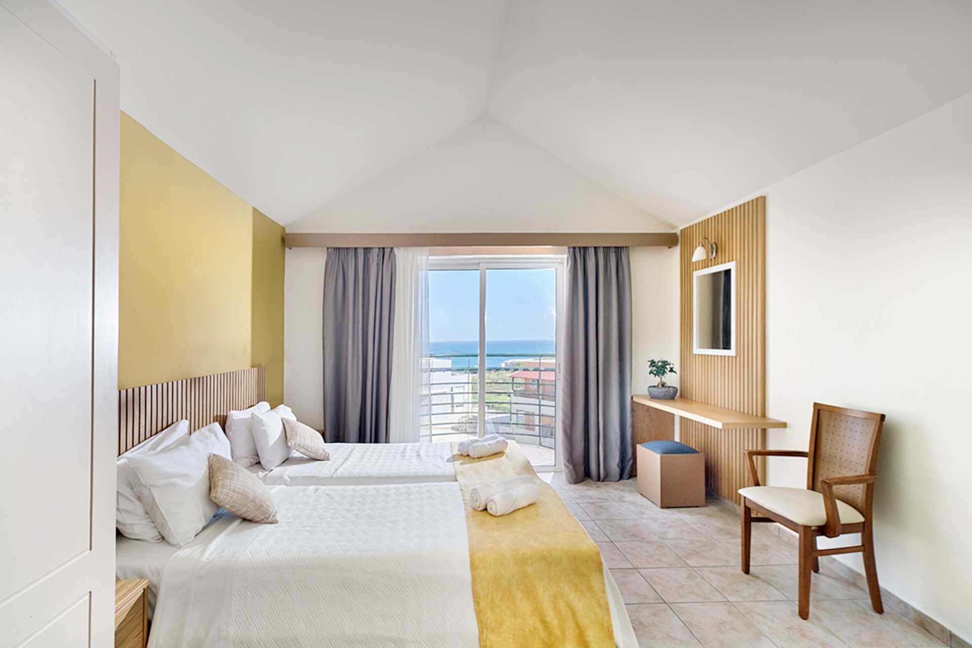 Driekamerappartement met balkon, sommige met uitzicht op het zwembad. Twee slaapkamers en een gecombineerde woonkamer/keuken. Twee eenpersoonsbedden in elke slaapkamer. Mogelijkheid voor extra bed op slaapbank met uitschuifbaar bed. Sommige appartementen hebben niveauverschillen met enkele treden. Minikeuken met kookplaten, koelkast met vriesvak, magnetron, koffiezetapparaat, waterkoker, broodrooster en eenvoudige keukenapparatuur. Wifi, airconditioning en kluis inbegrepen. TV met internationale zenders. Föhn. Badkamer met bad of douche en toilet. Schoonmaak 6 keer/week.