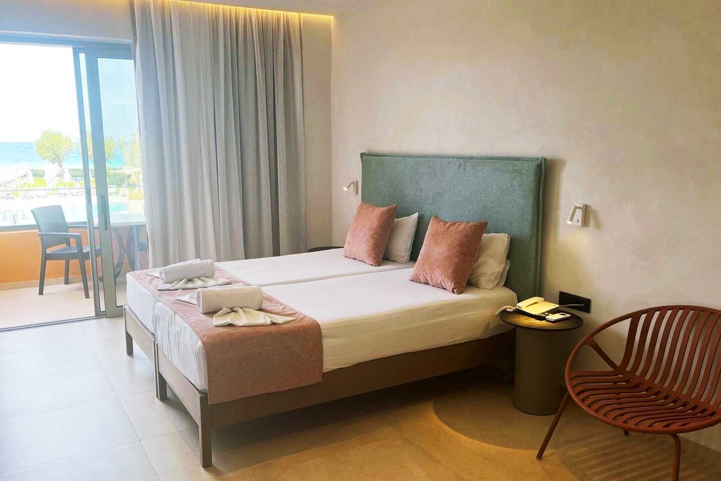 Tweekamerappartementen met balkon of grondbalkon, sommige appartementen met balkon hebben uitzicht op zee. Slaapkamer en gecombineerde slaapkamer met minikeuken. Twee éénpersoonsbedden. Mogelijk extra bedden in slaapbank. Minikeuken met kookplaten, koelkast, waterkoker en eenvoudig keukengerei. Gratis wifi en airconditioning. Kluisje tegen toeslag. Tv met satellietkanalen. Föhn. Bad/douche en toilet. Schoonmaak 6 keer/week. In dit type appartement zijn kinderen tot 2 jaar inbegrepen bij het maximum aantal personen in het appartement.