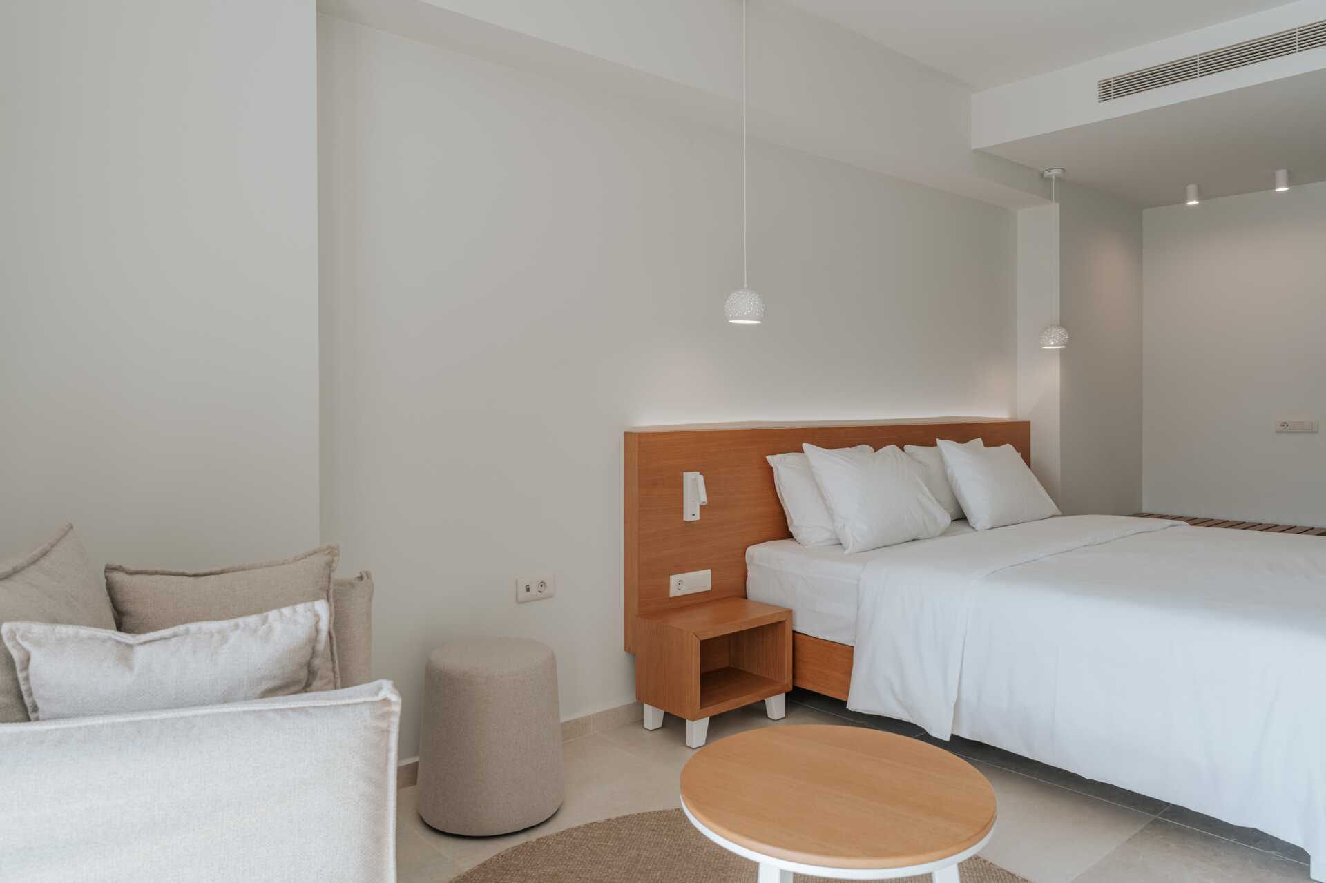Tweepersoonskamer in maisonnette met balkon, sommige met zeezicht of zwembadzicht of met groot balkon. De kamer heeft een open indeling. Op de entreeverdieping bevinden zich een badkamer en een kleine woonkamer. Boven is er een slaapvide met een tweepersoonsbed of twee eenpersoonsbedden. Wifi, airconditioning en kluisje inbegrepen. Koelkast, die tegen betaling als minibar kan worden gevuld. Waterkoker. Tv met internationale zenders. Badkamer met douche en apart toilet. Schoonmaak 6 keer/week.