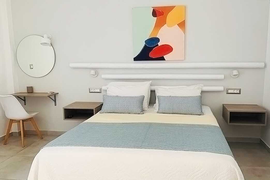 Tweekamerappartement met twee balkons van verschillende groottes. De balkons bevinden zich een halve tot anderhalve verdieping hoger. Eén slaapkamer en gecombineerde woonkamer met minikeuken. Een tweepersoonsbed of twee eenpersoonsbedden. Mogelijkheid voor extra bedden in slaapbank of extra bed. Minikeuken met koelkast, kookplaat, magnetron in sommige kamers, koffiezetapparaat, waterkoker en basiskeukengerei. Eén van de appartementen heeft twee buitendeuren. Bij aankomst staat er een fles water voor je klaar in het appartement. Airconditioning en wifi inbegrepen. Kluisje tegen betaling. Föhn. 2025 - gerenoveerde badkamer met douche en toilet. Schoonmaak 6 keer/week.