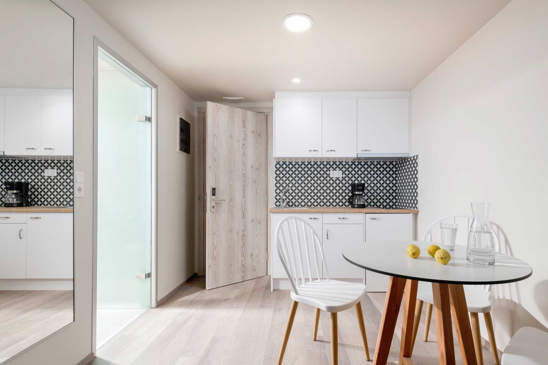 Studio met balkon, sommige met uitzicht op het zwembad. Gecombineerde slaapkamer met kitchenette. Twee eenpersoonsbedden. Mogelijkheid voor een extra bed op de slaapbank. Minikeuken met kookplaten, koelkast, waterkoker, koffiezetapparaat en basis keukengerei. Dagelijkse bijvulling van koffie en thee. Bij aankomst staat er een fles wijn, een fles water en fruit klaar in het appartement. Airconditioning en wifi inbegrepen. Kluis tegen betaling. TV met internationale zenders. Badjassen en slippers Föhn. Badkamer met douche en wc. Schoonmaak 7 keer/week.