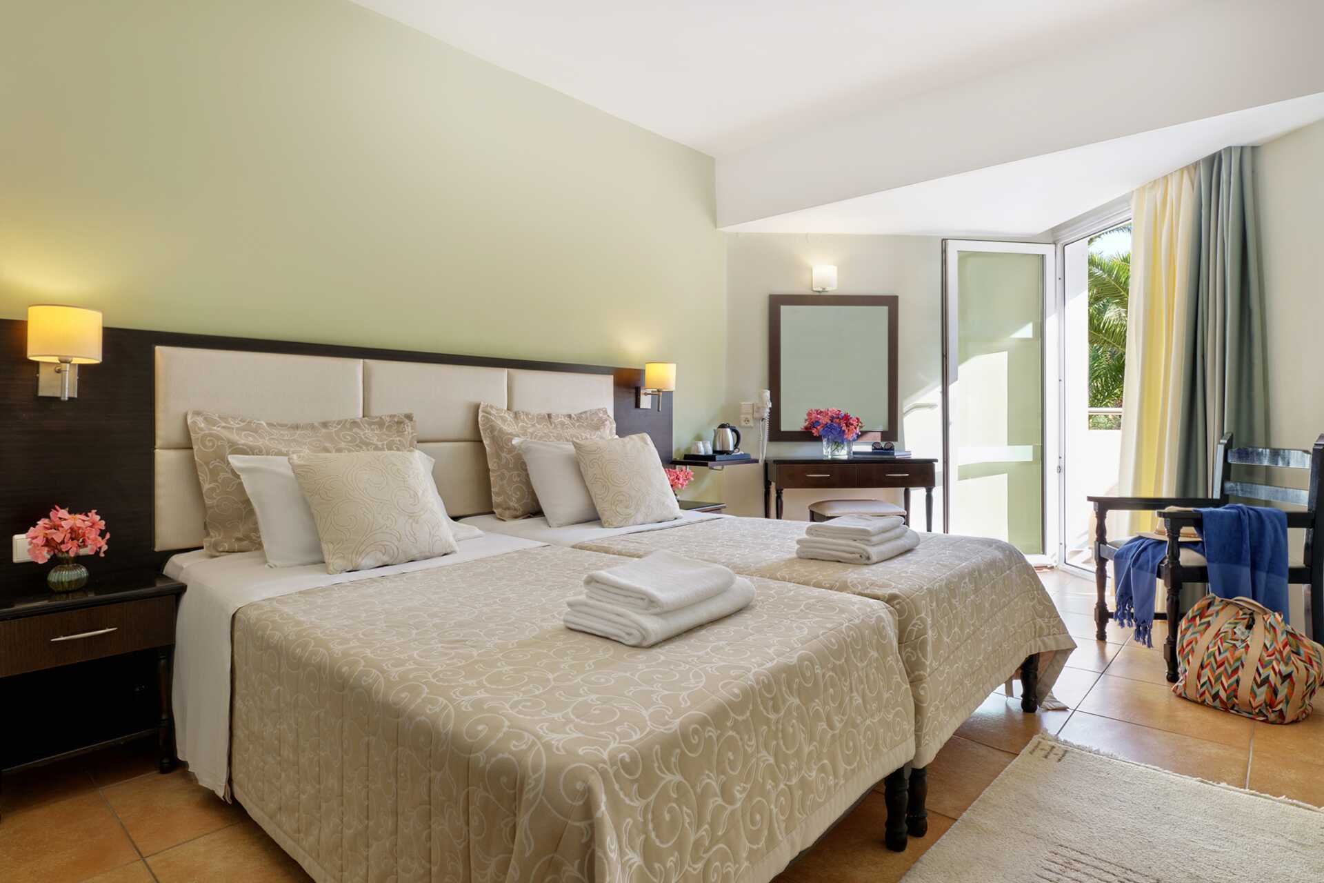 Familiekamer met balkon. De familiekamer bestaat uit een slaapkamer met twee eenpersoonsbedden en een woonkamer met de mogelijkheid tot extra bedden op een slaapbank. Wifi, airconditioning en kluisje inbegrepen. Koelkast. Waterkoker, koffie en thee. Nespresso-apparaat. Tv met satellietzenders. Hotelslippers. Föhn. Badkamer met douche en toilet. Schoonmaak 7 keer/week.
