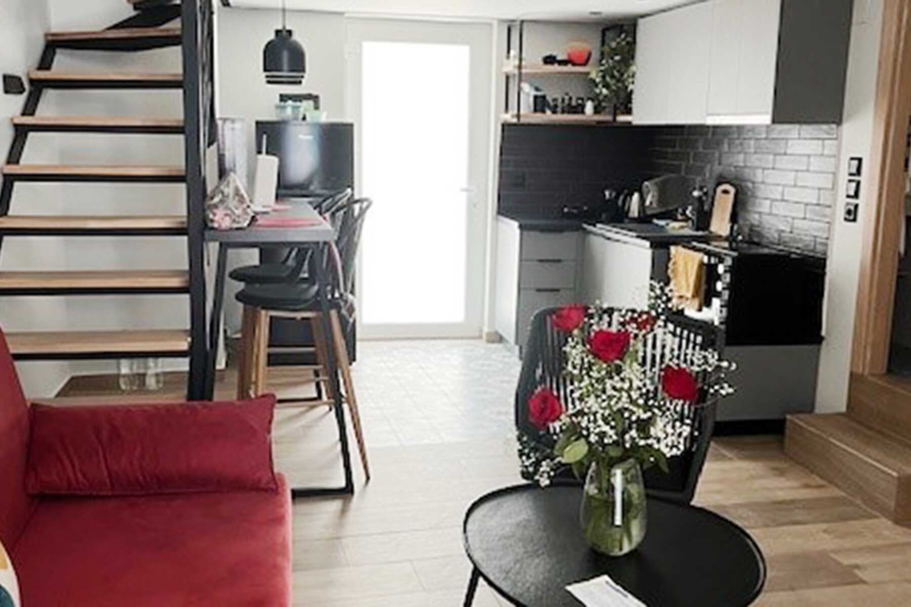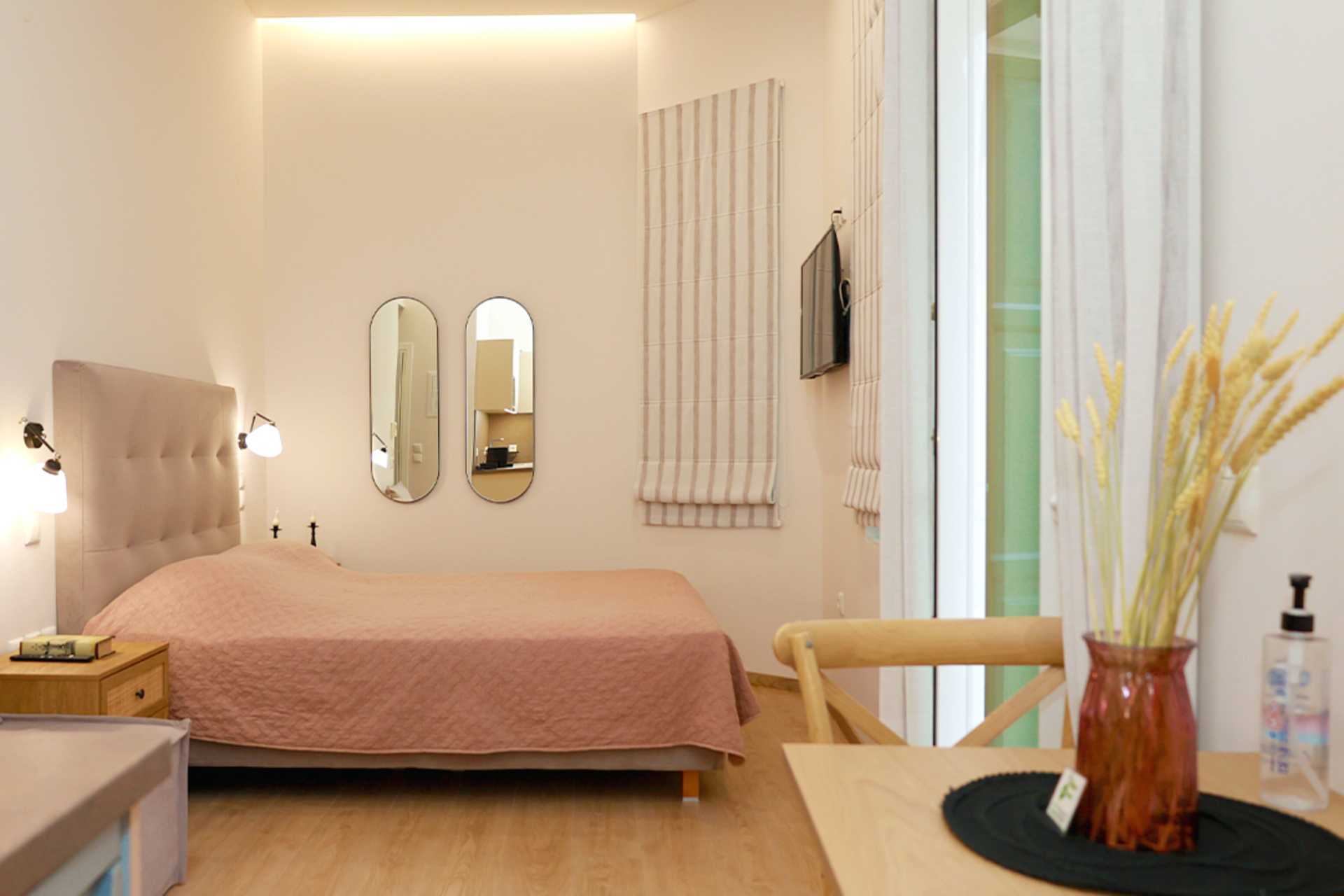 Studio in maisonette met terras. Twee eenpersoonsbedden of een tweepersoonsbed. Mogelijkheid tot een extra bed in de vorm van een slaapbank. Kitchenette met kookplaten, koelkast, magnetron, waterkoker, koffiezetapparaat en basiskeukengerei. Wifi, airconditioning en kluisje inbegrepen. Tv met internationale zenders. Wasmachine. Badjassen. Föhn. Badkamer met douche en toilet. Schoonmaak 6 keer/week.