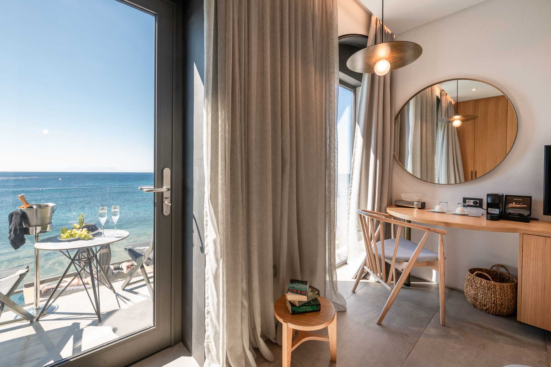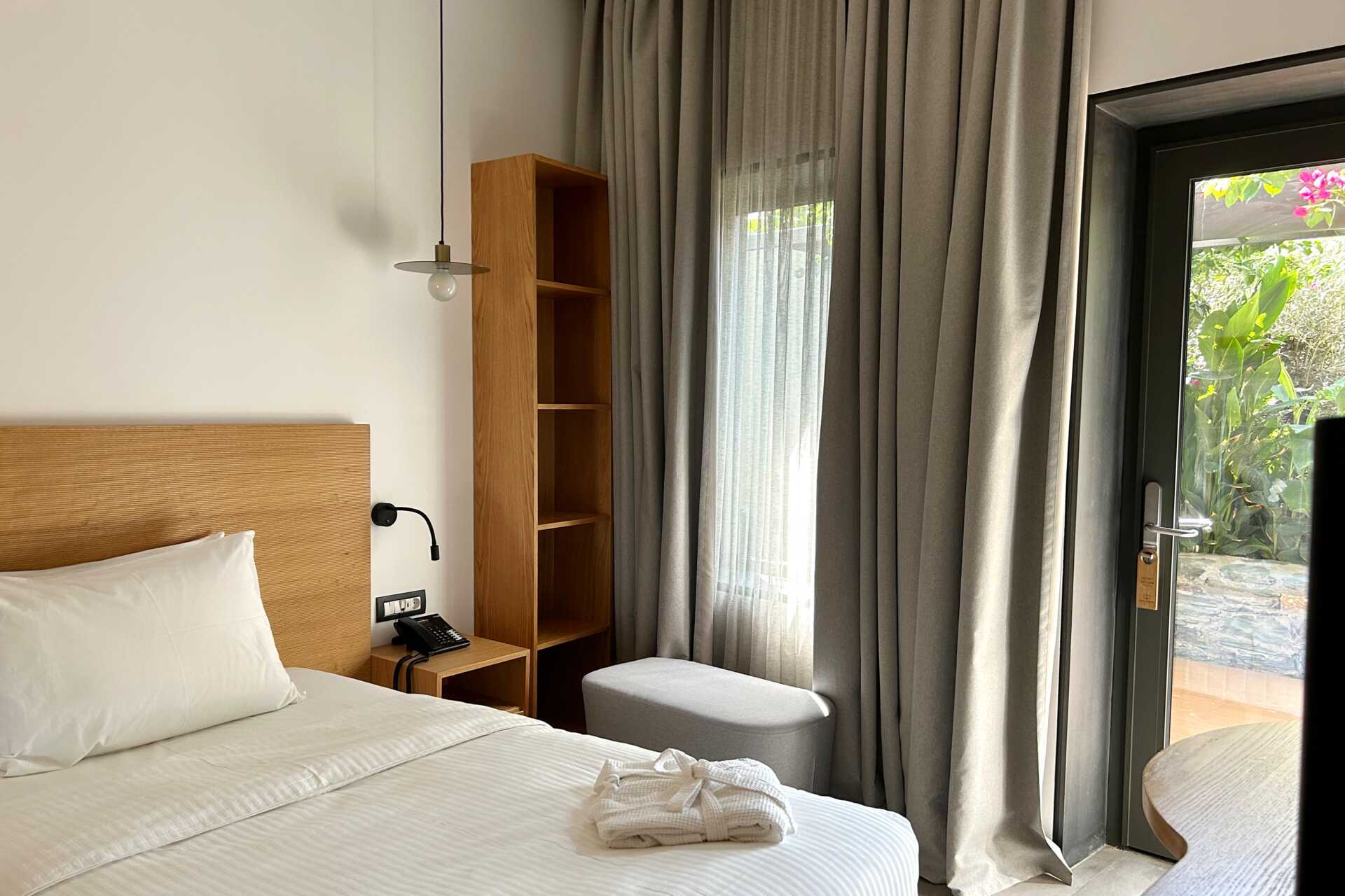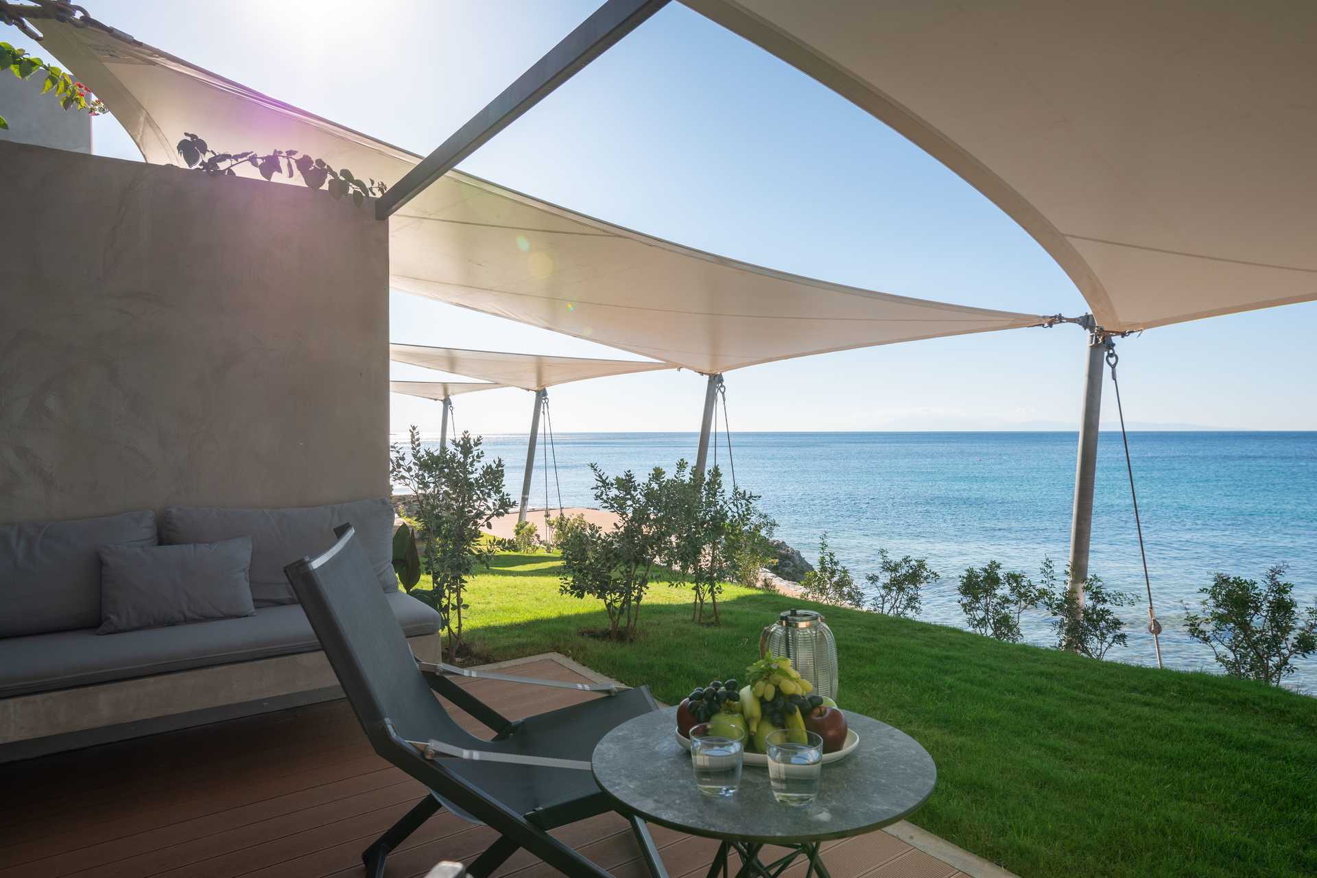Junior suite met terras, sommige met zeezicht. Het slaapcomfort is uitzonderlijk met een comfortabel tweepersoonsbed en linnengoed van hoge kwaliteit. Wifi, airconditioning en kluisje inbegrepen. Minibar/koelkast. Nespresso-apparaat, vier koffiecapsules zijn inbegrepen, extra capsules zijn te koop bij de receptie. Er is een comfortabele zithoek in de kamer en op de patio. Bluetooth-luidsprekers kunnen tegen een toeslag worden geleend bij de receptie. Haardroger. Badkamer met douche en toilet. Om de dag schoonmaak.