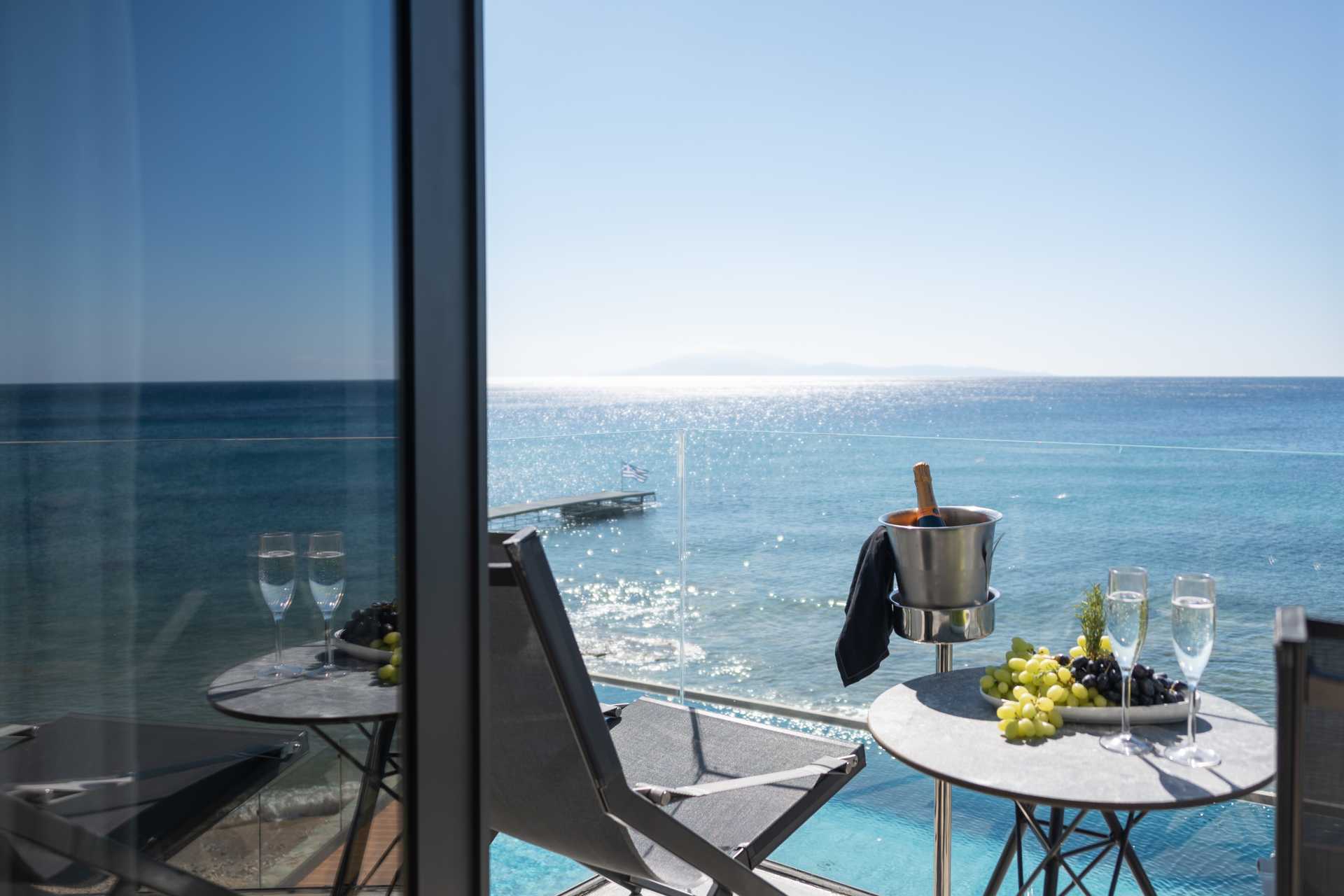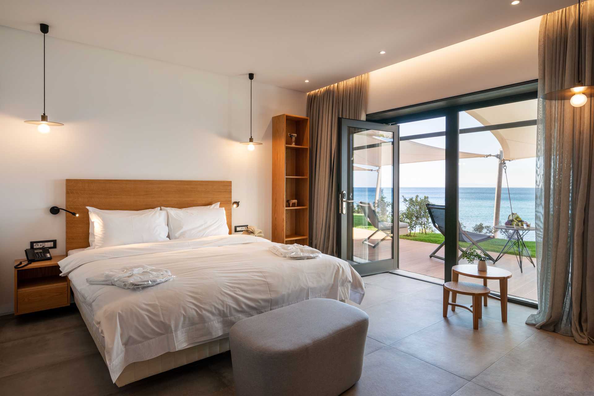 Deluxe kamer met terras en zeezicht. Het slaapcomfort is uitzonderlijk met een comfortabel tweepersoonsbed en linnengoed van hoge kwaliteit. Mogelijkheid tot een extra bed in de vorm van een eenpersoonsbed. Wifi, airconditioning en kluisje inbegrepen. Minibar/koelkast. Nespresso-apparaat, vier koffiecapsules inbegrepen, extra capsules zijn te koop bij de receptie. Bluetooth speakers zijn te leen bij de receptie tegen een toeslag. Badjassen. Haardroger. Badkamer met douche en toilet. Om de dag schoonmaak.
