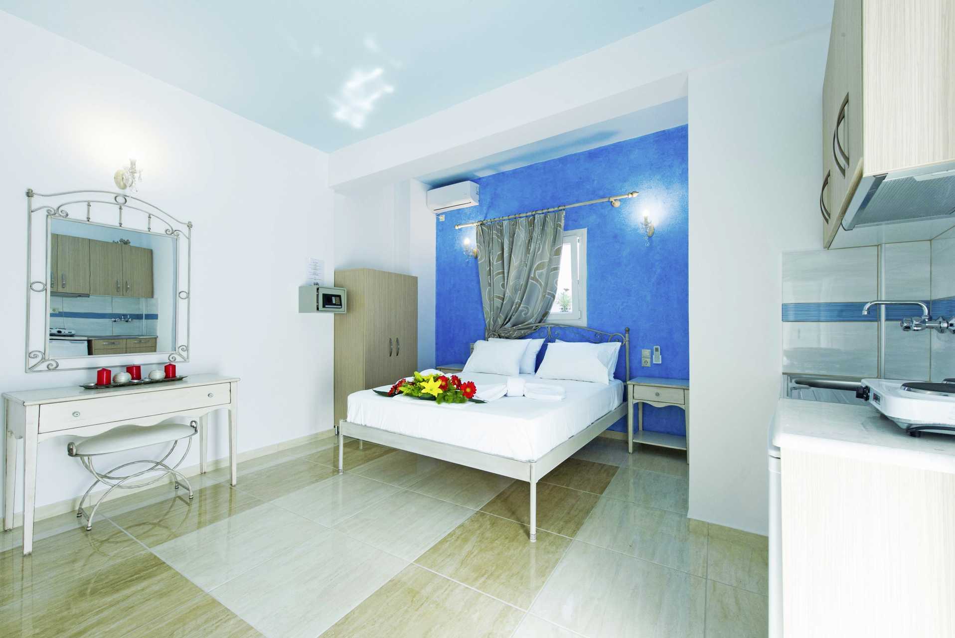 Studio met Balkon en Zwembadzicht of met Verhoogd terras en Zwembadzicht. Gecombineerde slaapkamer met kitchenette. Een tweepersoonsbed of twee eenpersoonsbedden. Mogelijkheid voor een extra bed in het appartement met Verhoogd terras. Kitchenette met kookplaat, koelkast, koffiezetapparaat, waterkoker, en basiskeukengerei. Wifi inbegrepen. Airconditioning en kluisje tegen betaling. Vanaf de zomer van 2026 zijn airconditioning en stortplaats inbegrepen. Tv met internationale zenders. Föhn. Badkamer met douche en toilet. Schoonmaak 6 keer/week.