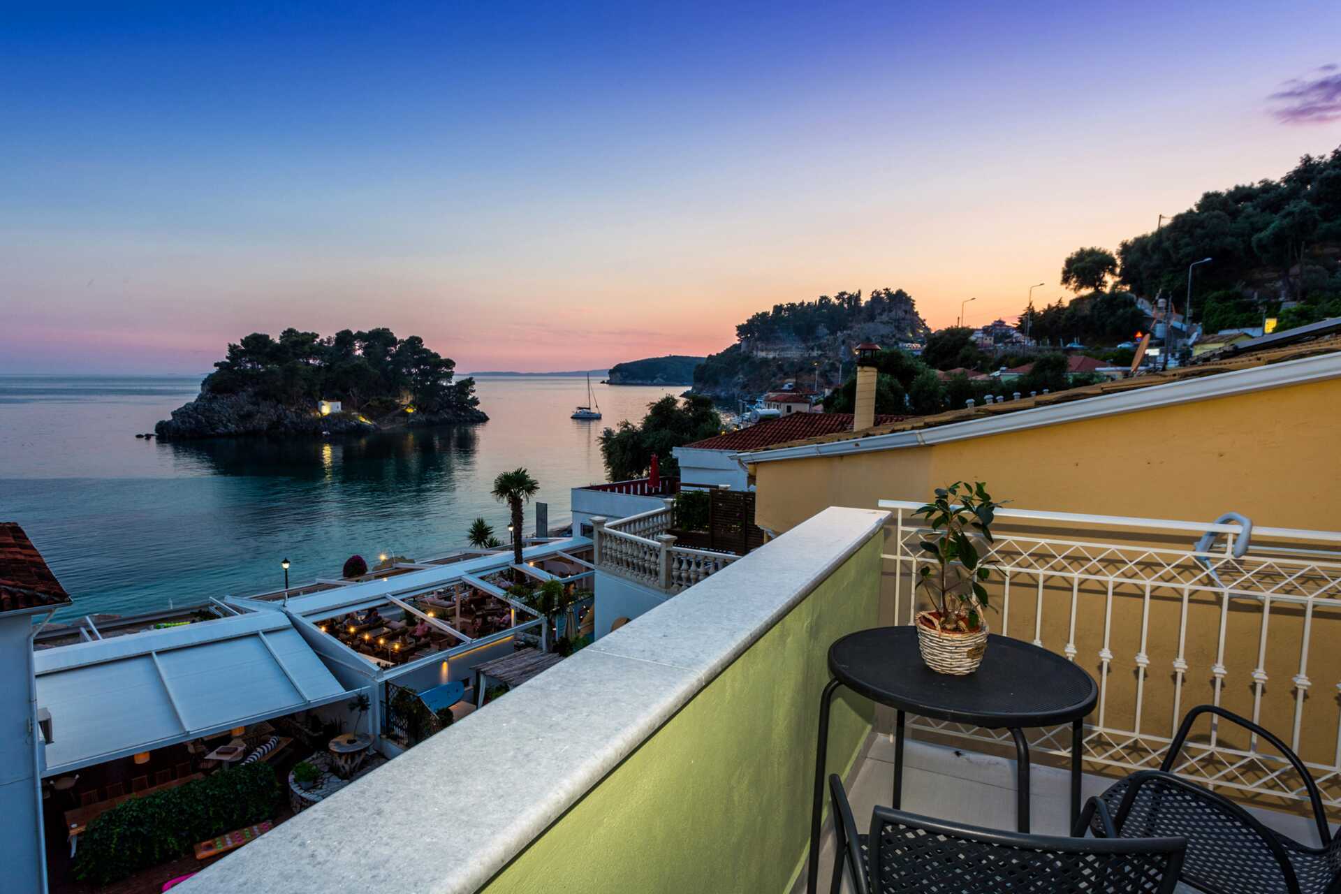 Deluxe kamer met balkon en uitzicht op zee. De luxe kamers op de bovenste verdieping van het huis hebben schuine plafonds. Een tweepersoonsbed of twee eenpersoonsbedden. In sommige kamers is het mogelijk een extra bed voor een kind te plaatsen. Houd er rekening mee dat de kamer krap wordt als er gebruik wordt gemaakt van het extra bed. Wifi, airconditioning en kluisje inbegrepen. Koelkast. Tv met internationale zenders. Föhn. Badkamer met douche en toilet. Schoonmaak 7 keer/week.