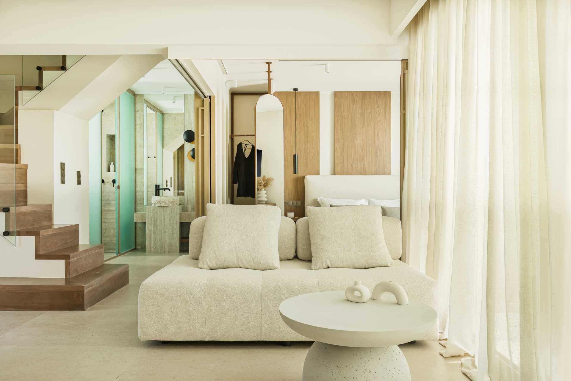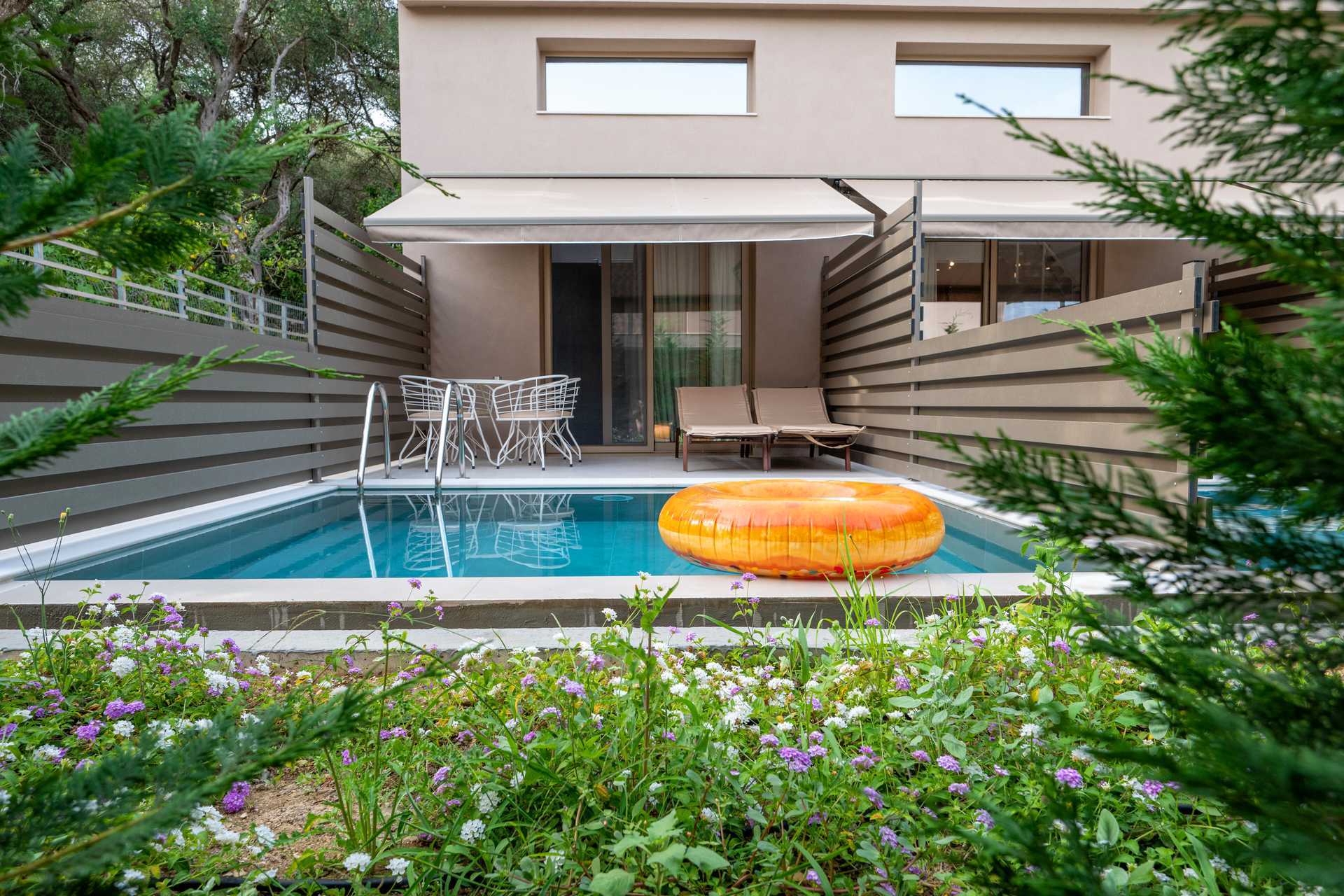 Suite met gelijkvloers terras, ligstoelen en privézwembad. Op de begane grond is er een tweepersoonsbed en een badkamer. Boven is er een slaapzolder met nog een tweepersoonsbed. Wifi, airconditioning (op de bovenverdieping) en kluisje inbegrepen. Koelkast. Waterkoker en koffie en thee. Espressomachine. TV met internationale zenders. Föhn. Badkamer met douche en toilet. Schoonmaak 7 keer/week.