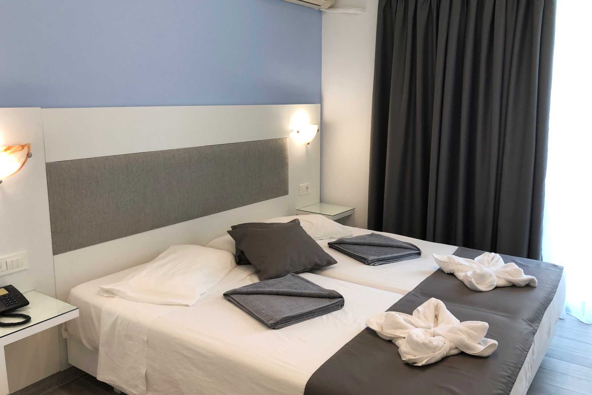 Superior kamer met terras op de begane grond en toegang tot gedeeld zwembad. De kamer kijkt uit op het zwembad aan de achterkant van het hotel. Twee eenpersoonsbedden of een tweepersoonsbed. Wifi, airconditioning en kluisje inbegrepen. Tv met internationale zenders. Föhn. Glazen wand naar badkamer met bad of douche en toilet. Schoonmaak 5 keer/week.