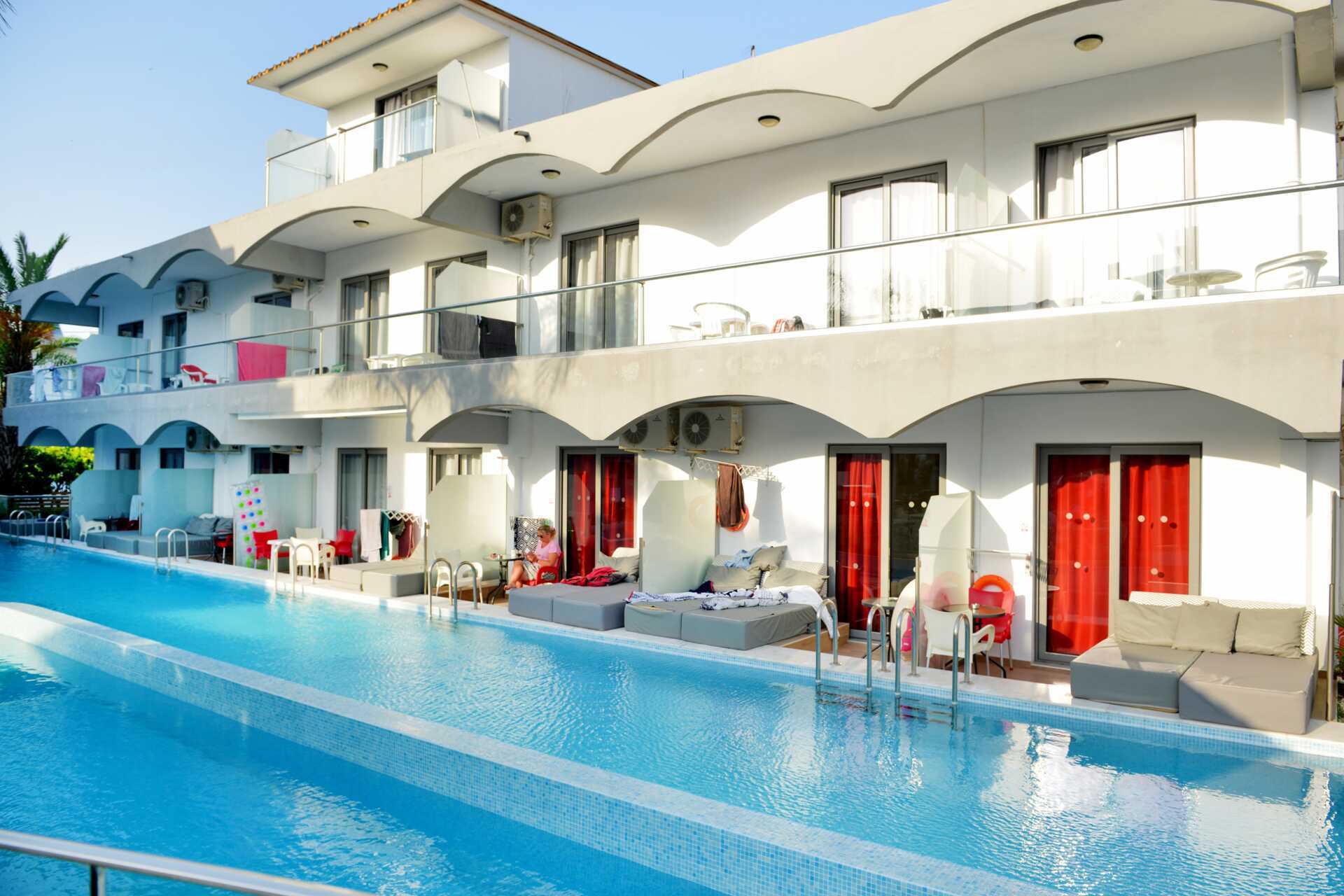 Tweekamerappartement met balkon, sommige met uitzicht op het zwembad. Slaapkamer en gecombineerde woonkamer met kitchenette. Een deel van de appartementen heeft een matglazen wand als afscheiding tussen de kamers, de wand loopt niet helemaal door tot aan het plafond. Twee eenpersoonsbedden of een tweepersoonsbed. Mogelijkheid tot extra bedden in de vorm van een slaapbank. Kitchenette met kookplaat, koelkast, waterkoker, koffiezetapparaat en basiskeukengerei. Wifi, airconditioning en kluisje inbegrepen. Tv met internationale zenders. Föhn. Badkamer met bad of douche en toilet. Schoonmaak 5 keer/week.