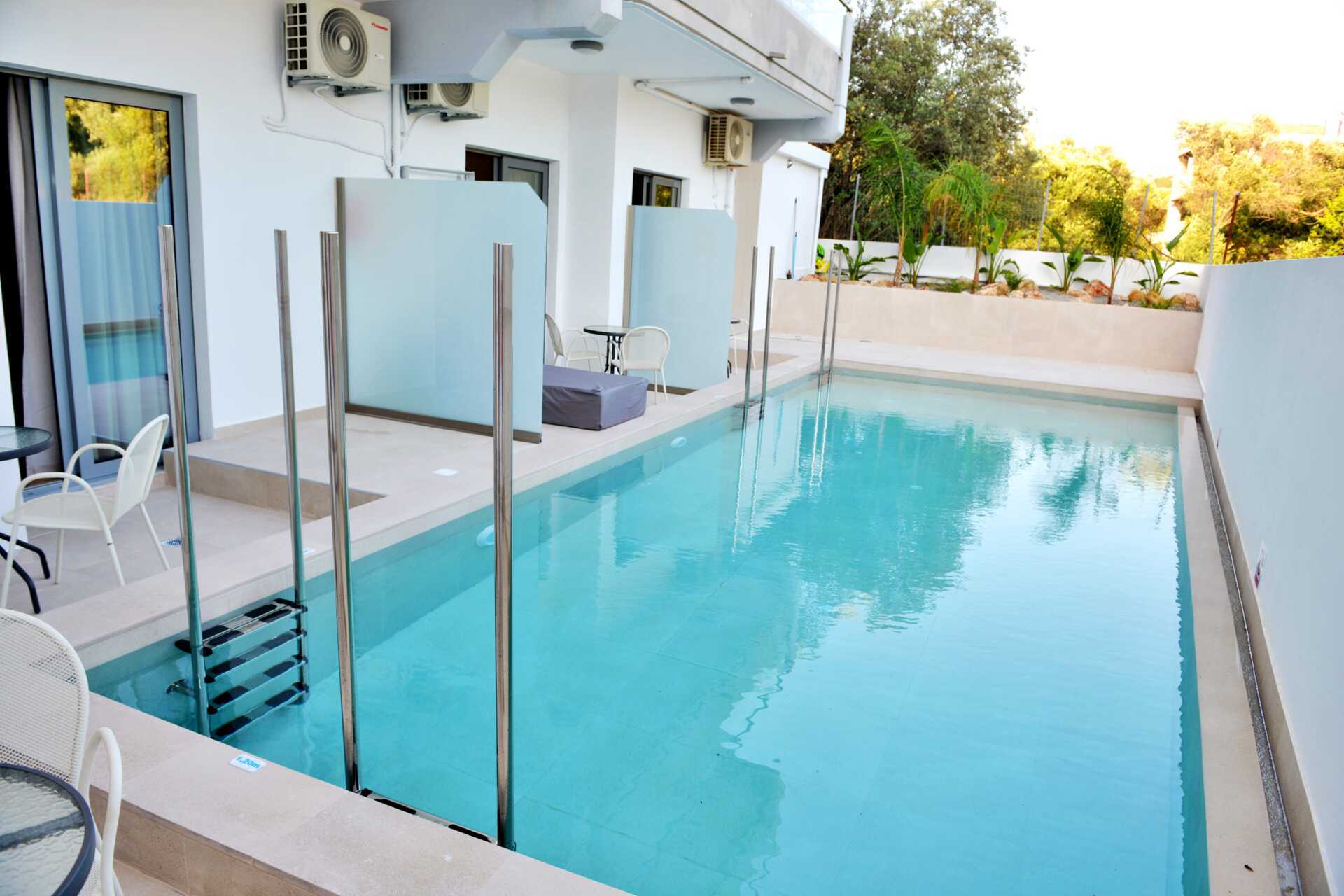 Tweekamerappartement met terras en uitgang naar gedeeld zwembad. Het appartement kijkt uit op het grote zwembad. Slaapkamer en gecombineerde woonkamer met kitchenette. De indeling verschilt per appartement. Een deel van de appartementen heeft een matglazen wand als afscheiding tussen de kamers, de wand loopt niet helemaal door tot aan het plafond. Twee eenpersoonsbedden of een tweepersoonsbed. Mogelijkheid tot extra bedden in de vorm van een slaapbank. Kitchenette met kookplaat, koelkast, waterkoker, koffiezetapparaat en basiskeukengerei. Wifi, airconditioning en kluisje inbegrepen. Tv met internationale zenders. Föhn. Glazen wand naar badkamer met bad of douche en toilet. Schoonmaak 5 keer/week.