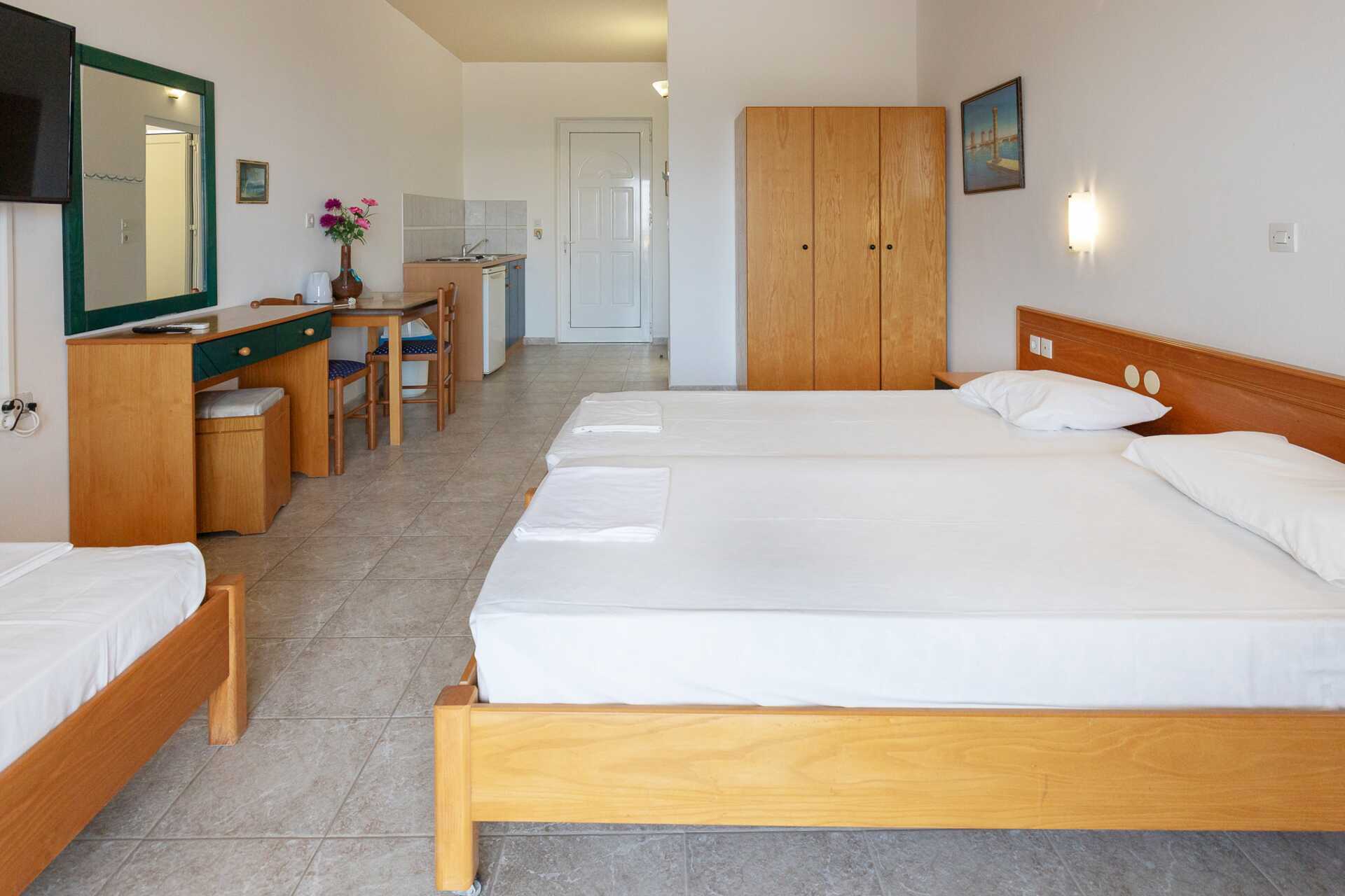 Studio met balkon of balkon op de begane grond. Slaapkamer gecombineerd met kitchenette. Een tweepersoonsbed of twee eenpersoonsbedden. Mogelijkheid voor een extra bed in een eenpersoonsbed. Wifi en kluisje inbegrepen. Airconditioning tegen betaling. Minikeuken met koelkast, kookplaat, waterkoker en eenvoudige keukenapparatuur. Tv met internationale zenders. Föhn. Badkamer met bad of douche en toilet. Schoonmaak 5 keer/week.