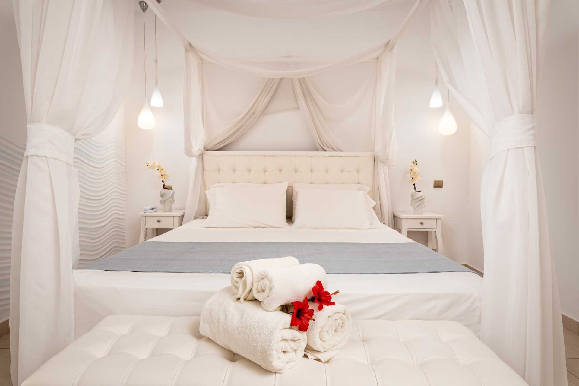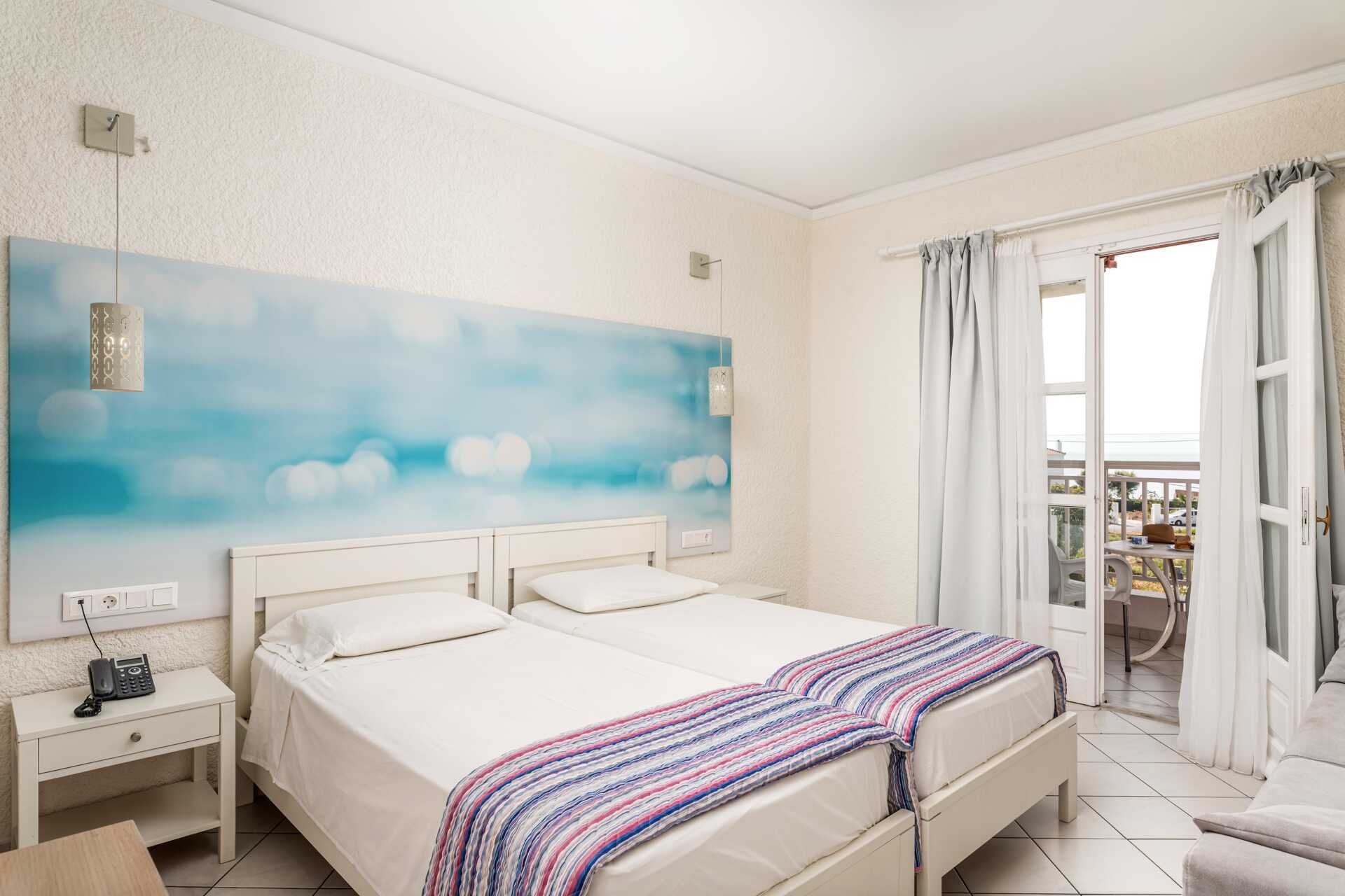 Tweepersoonskamer, voorzijde, met balkon en uitzicht op zee. De minimumleeftijd voor dit kamertype is 16 jaar. Een tweepersoonsbed. Wifi, airconditioning en kluis inbegrepen. Koelkast. TV met internationale zenders. Badjassen en slippers Föhn. Badkamer met douche en wc. Schoonmaak 7 keer/week.