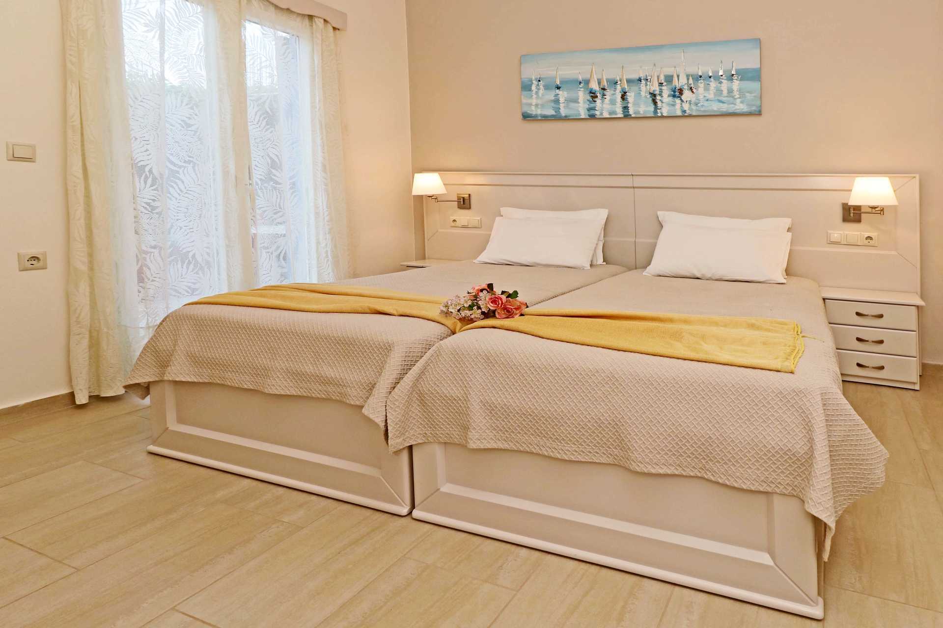 Tweekamerappartement met Gedeelde buitemruimte met Zeezicht of Terras met Beperkt zeezicht. Sommige appartementen hebben één slaapkamer en een gecombineerde woonkamer met een minikeuken, terwijl andere appartementen één slaapkamer en een aparte keuken met eethoek hebben. Een tweepersoonsbed of twee eenpersoonsbedden. Minikeuken met kookplaten, waterkoker, koffiezetapparaat, broodrooster, koelkast en eenvoudige keukenapparatuur. Wifi, kluisje en airconditioning inbegrepen. Föhn. Badkamer met bad of douche en toilet. Schoonmaak 6 keer/week.