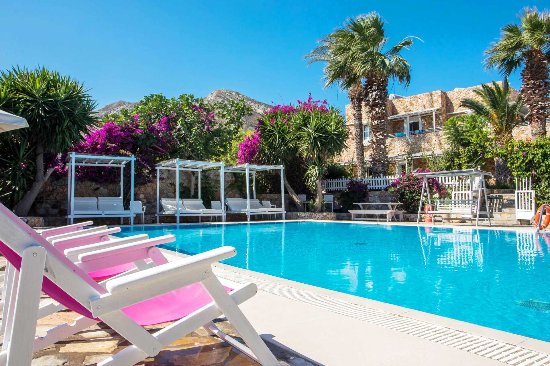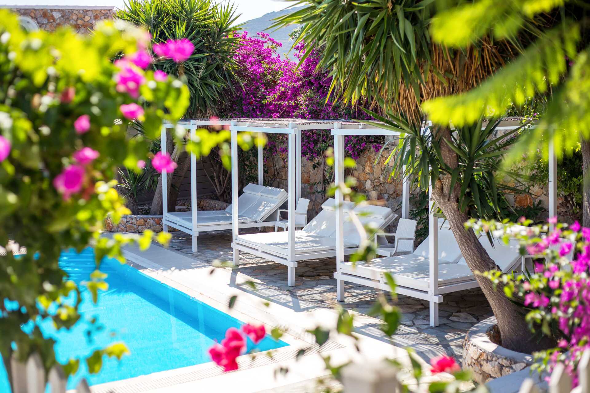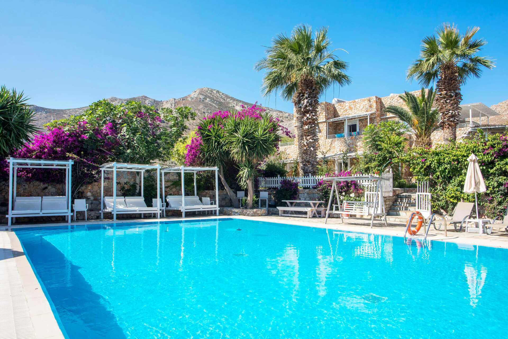 Charmant hotel Irini heeft een klein zwembad in de tuin met ligbedden en parasols om te lenen. Het is een korte wandeling naar het strand. De stranden op Tilos zijn grind- of steenstranden en het water is helder en fijn.