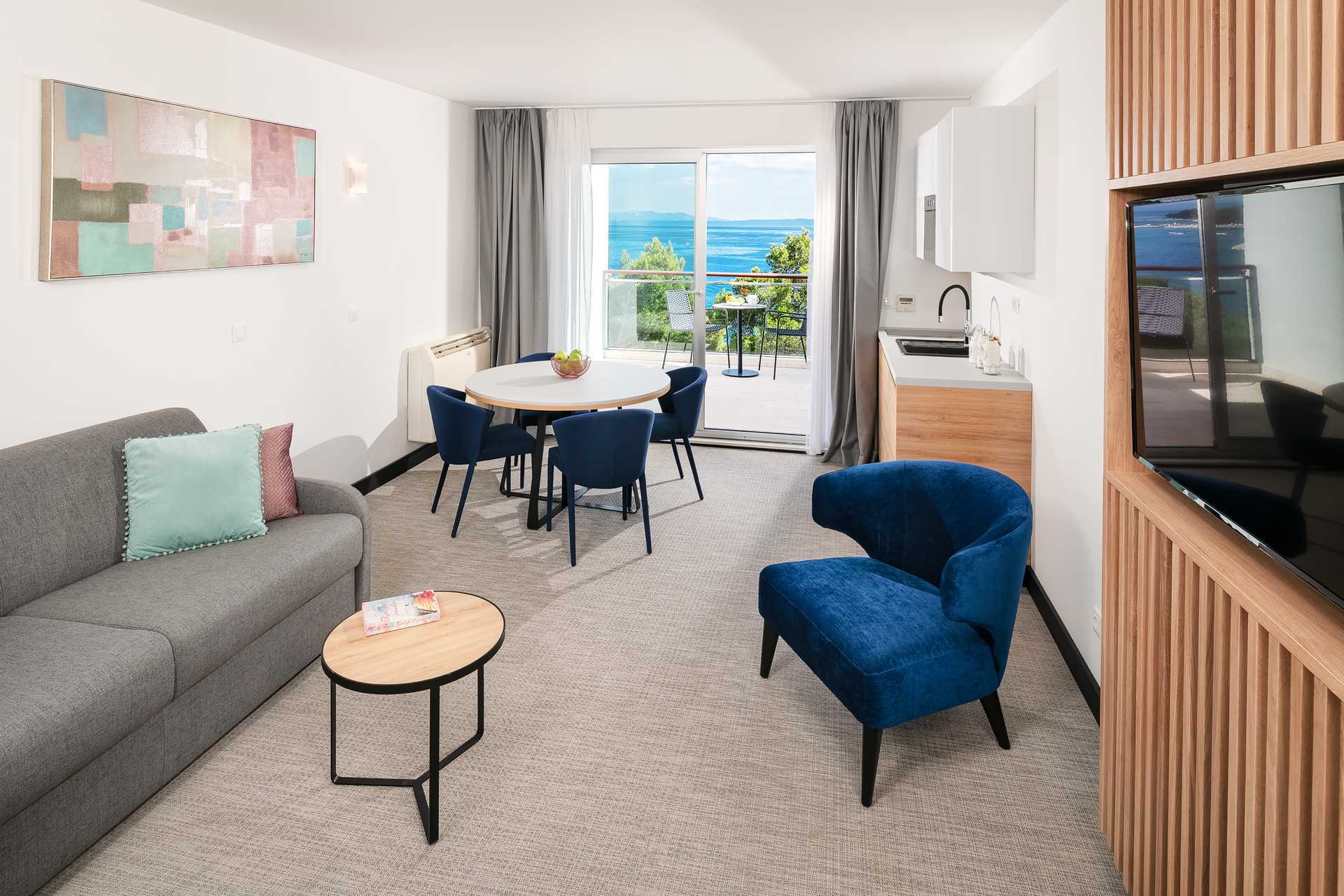 Appartement met één slaapkamer, groot balkon of terras en beperkt zeezicht. Slaapkamer gecombineerd met kitchenette. Een slaapbank zoals een gewoon bed. Minikeuken met koelkast, kookplaat, waterkoker en eenvoudige keukenapparatuur. Wifi, airconditioning en kluis inbegrepen. Tv met internationale zenders. Föhn. Badkamer met douche en toilet. Schoonmaak 6 keer/week.
