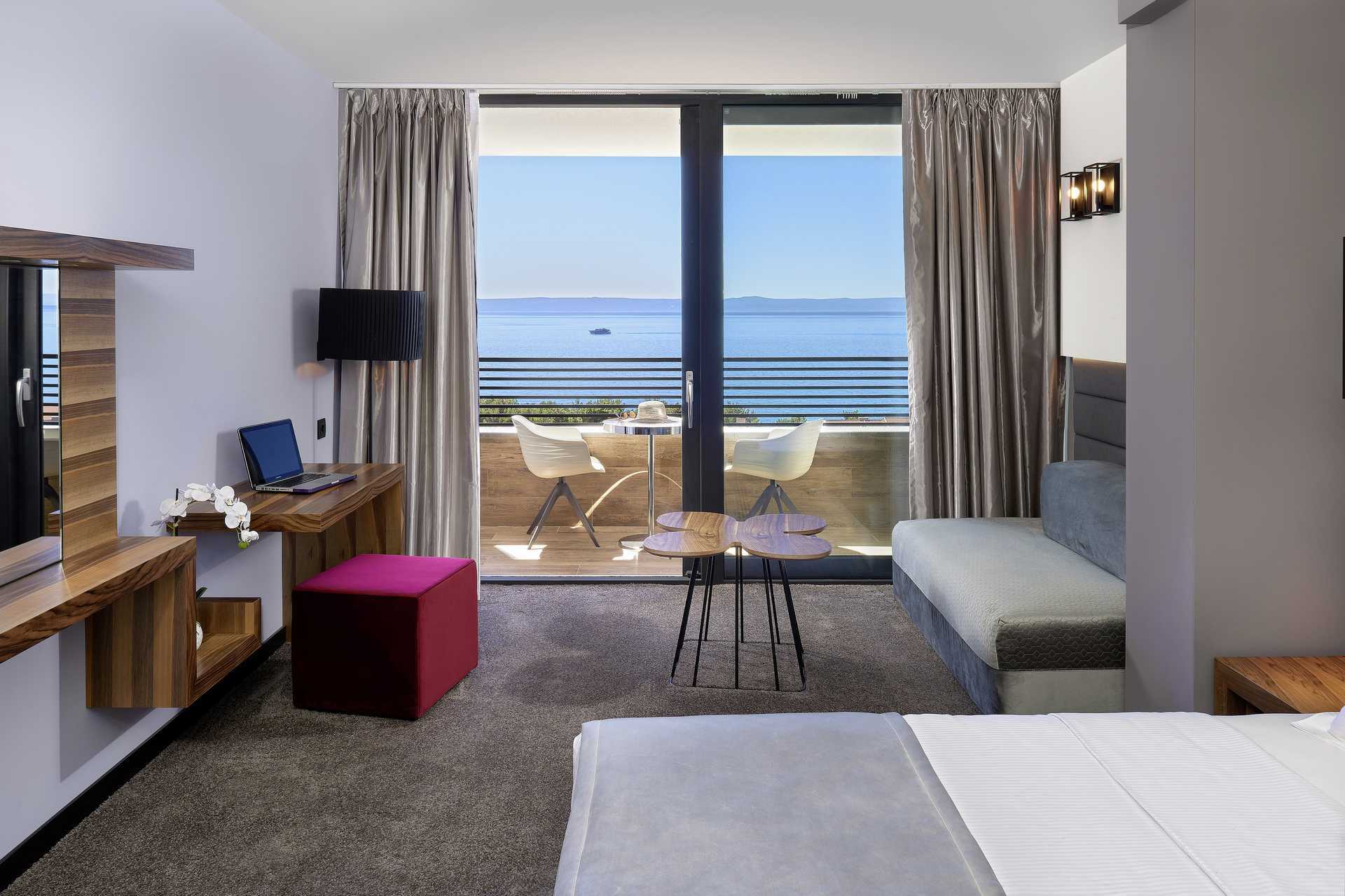 Deluxe kamer met balkon en uitzicht op zee of met beperkt uitzicht op zee. Een tweepersoonsbed. Wifi, airconditioning en kluisje inbegrepen. Minibar. Waterkoker en koffie en thee. Tv met internationale zenders. Vloerbedekking. Badjassen en hotelslippers. Föhn. Badkamer met bad of douche en toilet. Schoonmaak 7 keer/week.