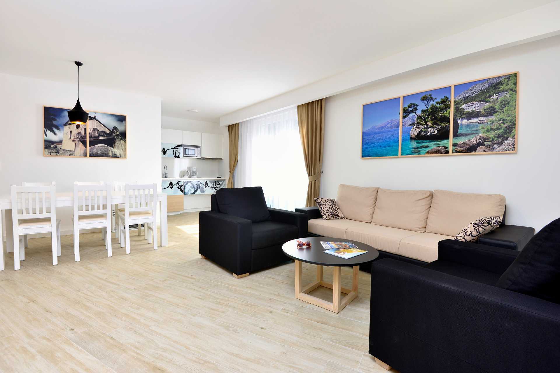 Driekamerappartement met balkon of terras. Soms is het aantal tuinmeubelen kleiner dan het aantal mensen dat in het appartement woont. Slaapkamer en gecombineerde woonkamer met kitchenette. In elke slaapkamer een tweepersoonsbed of twee eenpersoonsbedden. Mogelijkheid voor extra bedden in slaapbank. Minikeuken met kookplaten, koelkast, koffiezetapparaat, waterkoker, magnetron, tosti-ijzer en basis keukenuitrusting. Wifi, airconditioning en kluisje inbegrepen. Tv met internationale zenders. Strijkijzer en strijkplank. Föhn. Badkamer met douche en toilet. Schoonmaak 7 keer/week.
