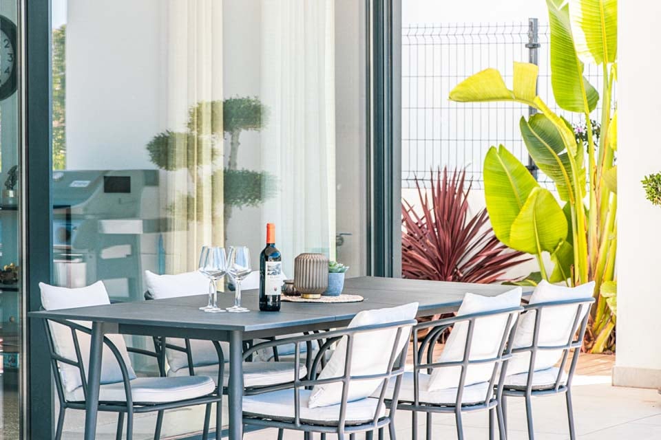 Overdekt terras, dineren in de openlucht, faciliteiten voor dineren in de openlucht, eetfaciliteiten, barbecue, gasbarbecue, tuinmeubilair, ligstoelen, fitnessapparatuur
