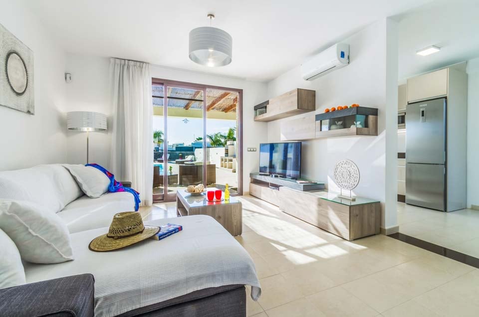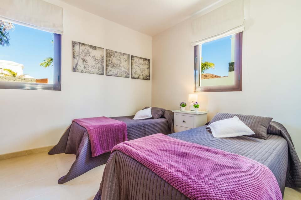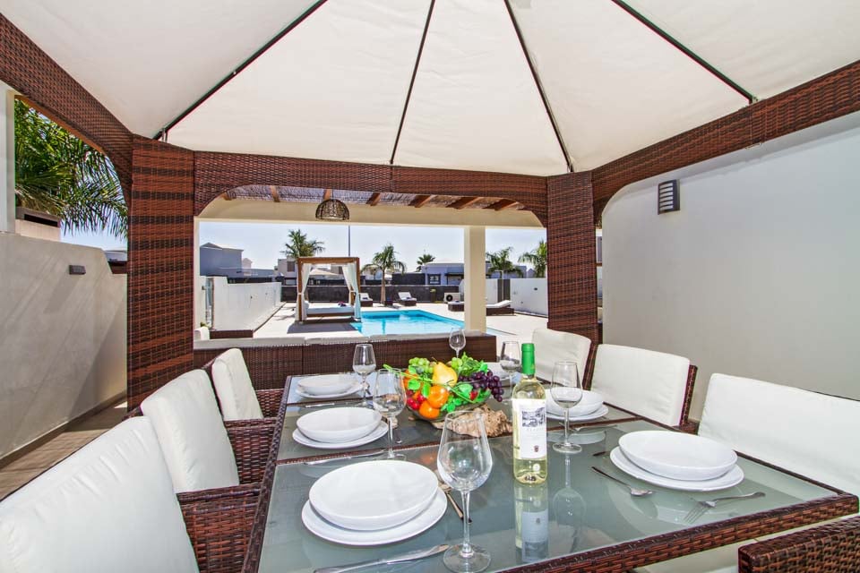 Villa Anibal ligt in het hart van de chique woonwijk Las Maretas, ten westen van Playa Blanca. Het is een van de drie moderne en stijlvolle villa's met alle voorzieningen voor een perfecte vakantie. De woning is verdeeld over twee verdiepingen. Op de begane grond vindt u een moderne en comfortabele lounge met meerdere Britse zenders, een spelcomputer en eetgelegenheid voor zes personen. Aansluitend vindt u een moderne en volledig uitgeruste keuken. Op deze verdieping bevindt zich een slaapkamer met twee eenpersoonsbedden en een familiebadkamer. Op de eerste verdieping vindt u de hoofdslaapkamer met tweepersoonsbed en een doucheruimte, en nog een slaapkamer met twee eenpersoonsbedden. Beide slaapkamers hebben toegang tot het ruime terras. Voor uw gemak zijn de woonkamer en alle slaapkamers voorzien van airconditioning. U zult de meeste tijd doorbrengen in de ruime buitenruimte. In het midden ligt een schitterend zwembad met vloeiende vormen (inclusief verwarming van november tot en met april). Onder de grote pergola vindt u volop comfortabele rieten zitjes en nog meer eetgelegenheden. Ook is er een stenen barbecue met spoelbak, zodat u heerlijk buiten kunt eten. Er is een dagbed bij het zwembad voor wie wil ontspannen. Ook staan er een tafeltennistafel en een pooltafel tot de beschikking van de gasten. Er zijn diverse bars en restaurants op loopafstand en er is ook een regelmatige busverbinding naar het centrum van Playa Blanca. Voor wie met een groter gezelschap op vakantie wil, liggen de zustervilla's Fito en Pedro vlakbij.