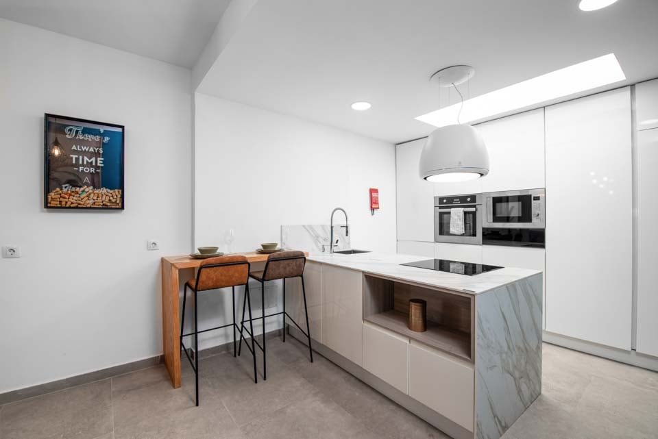 Oven, kookplaat, magnetron, vriezer, koelkast, koel-vriescombinatie, vaatwasser, eetgelegenheid