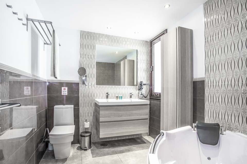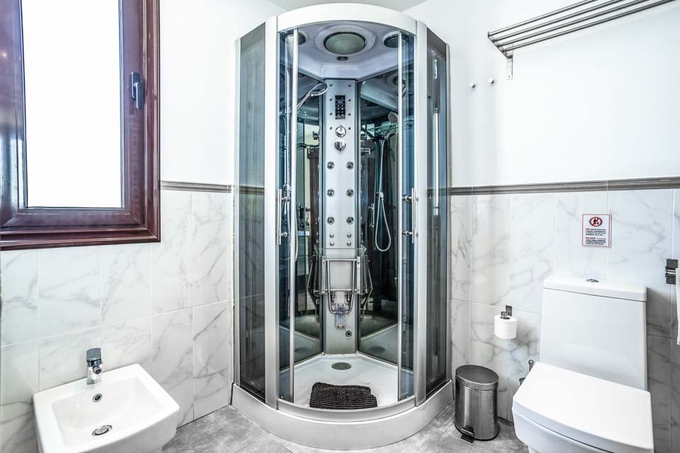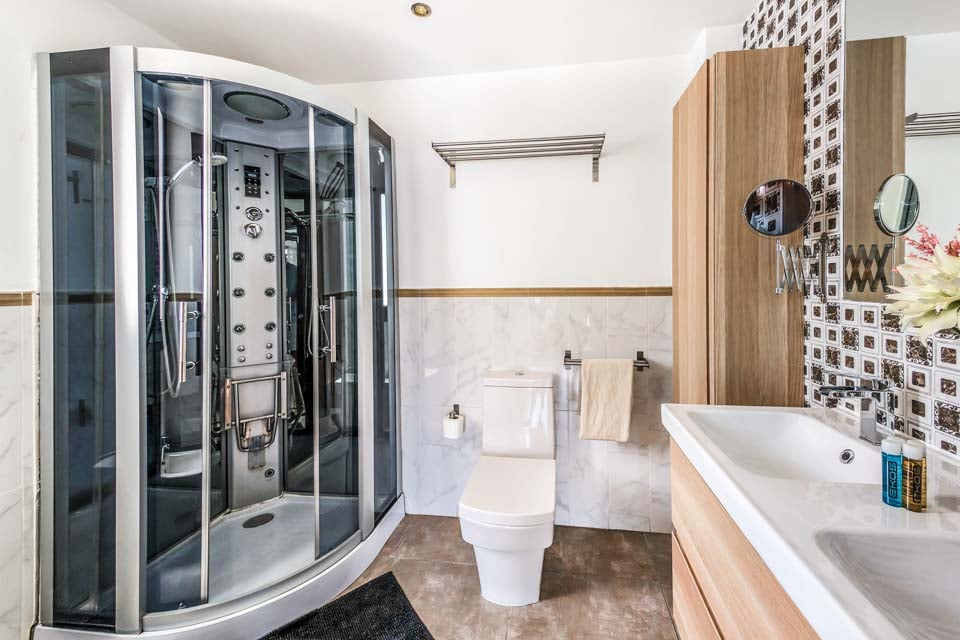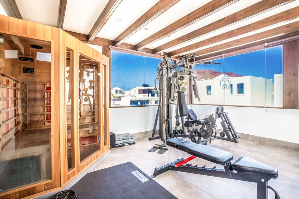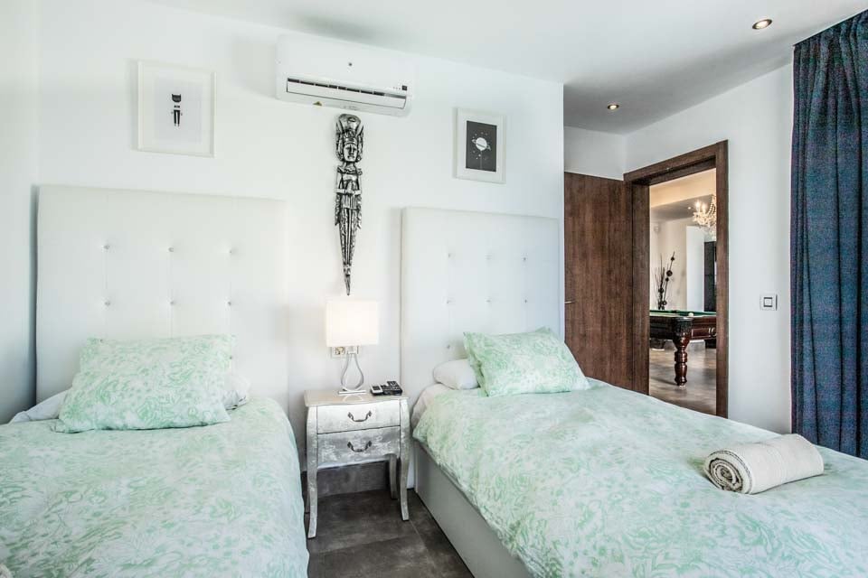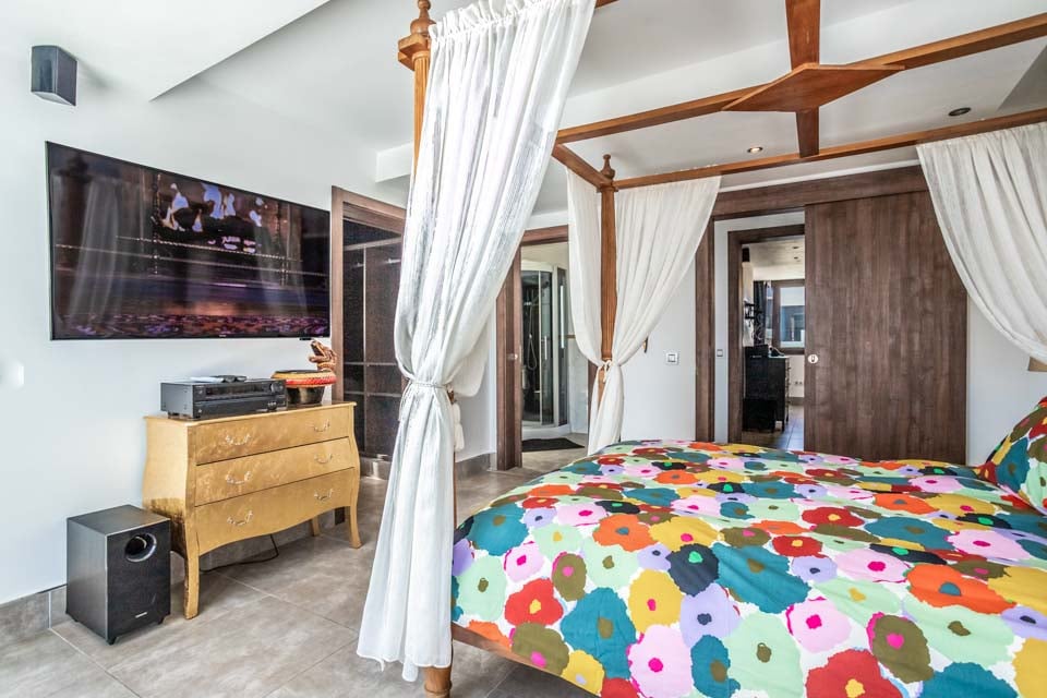Boven bevinden zich twee indrukwekkende kamers met eigen badkamer en verborgen extra's die het plaatje compleet maken. Hier vindt u de tweede slaapkamer met hemelbed, voorzien van een verkwikkende hydromassagedouche, een grote flatscreen-tv en toegang tot uw eigen sportschool met een prachtig uitzicht op zee, waar u in stijl kunt sporten. De hoofdslaapkamer beschikt over een badkamer, waar u heerlijk kunt ontspannen. Elke kamer komt uit op een indrukwekkend terras, waar u ook een dartbord en een tafeltennistafel vindt. In deze prachtige villa is werkelijk alles tot in de puntjes verzorgd. Als extraatje krijgt u bij deze villa gratis badhanddoeken voor de duur van uw verblijf.