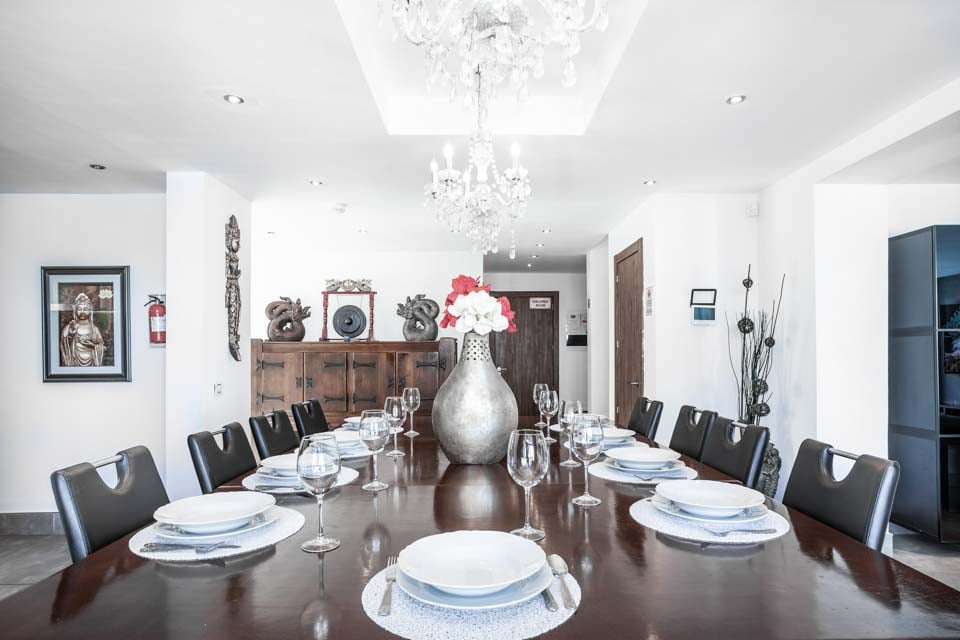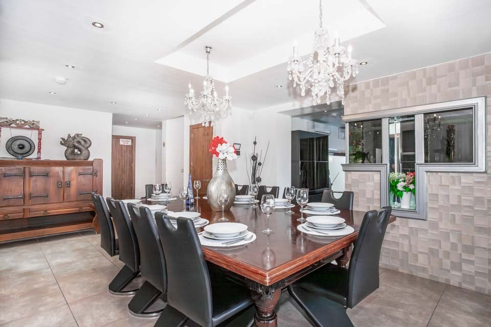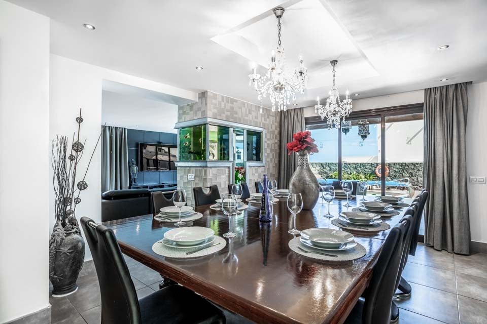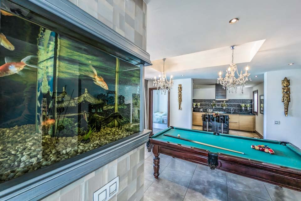 Bij binnenkomst wordt u direct verrast door het lichte interieur met zijn moderne, panoramische ramen. 's Avonds heeft u vanuit de lounge bovendien een fantastisch uitzicht op het zwembad. Deze ultramoderne leefruimte biedt u een indrukwekkende thuisbioscoop en een supercomfortabele U-vormige leren bank waarin u heerlijk kunt ontspannen. In het eetgedeelte staat een prachtig tropisch aquarium met een ruime eettafel die u op indrukwekkende wijze kunt omtoveren tot een pooltafel!