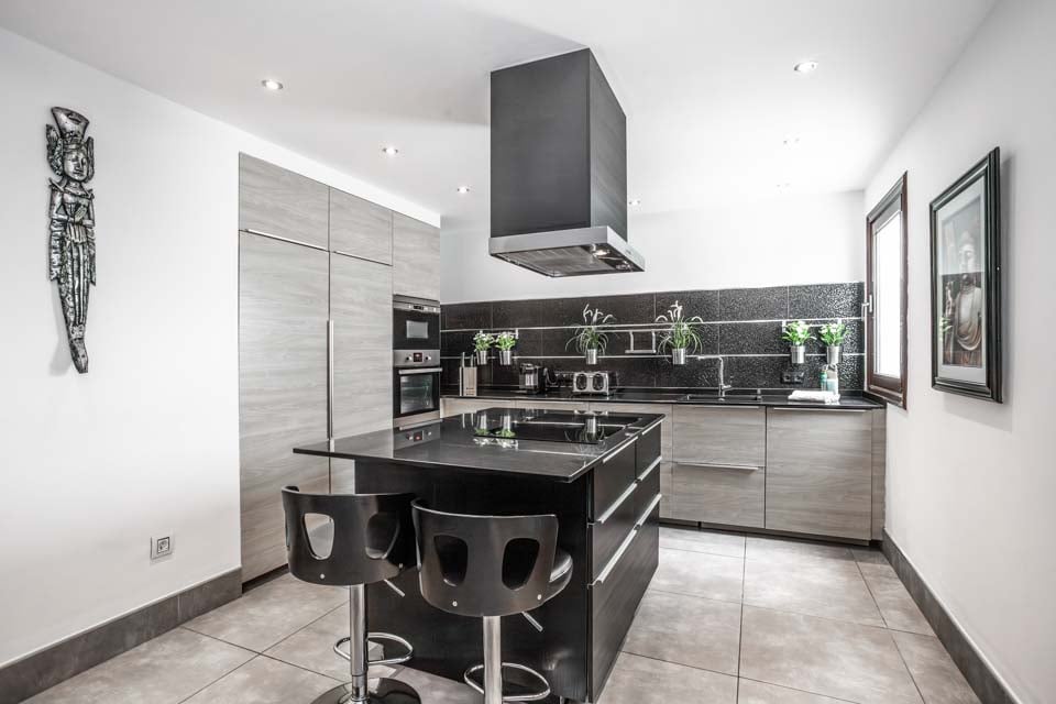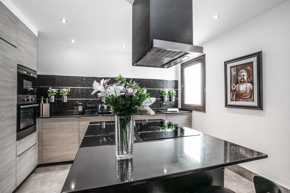 De stijlvolle keuken is uitstekend uitgerust en netjes ontworpen met topkwaliteit apparatuur. Ook beschikt de keuken over een modern kookeiland waar u zowel kunt koken als eten. In het midden bevindt zich een kookplaat met tiptoetsen en daaromheen kunt u zitten.