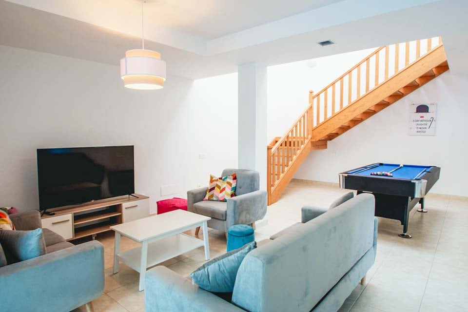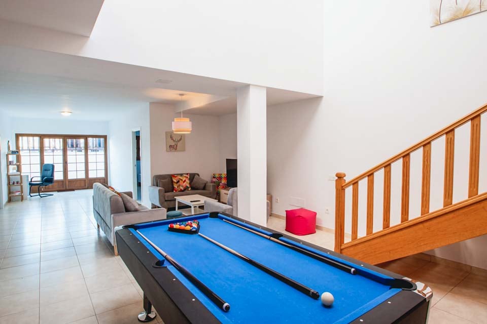 Comfortabele zithoek, smart-tv, pooltafel, bureau, dartbord, openslaande deuren