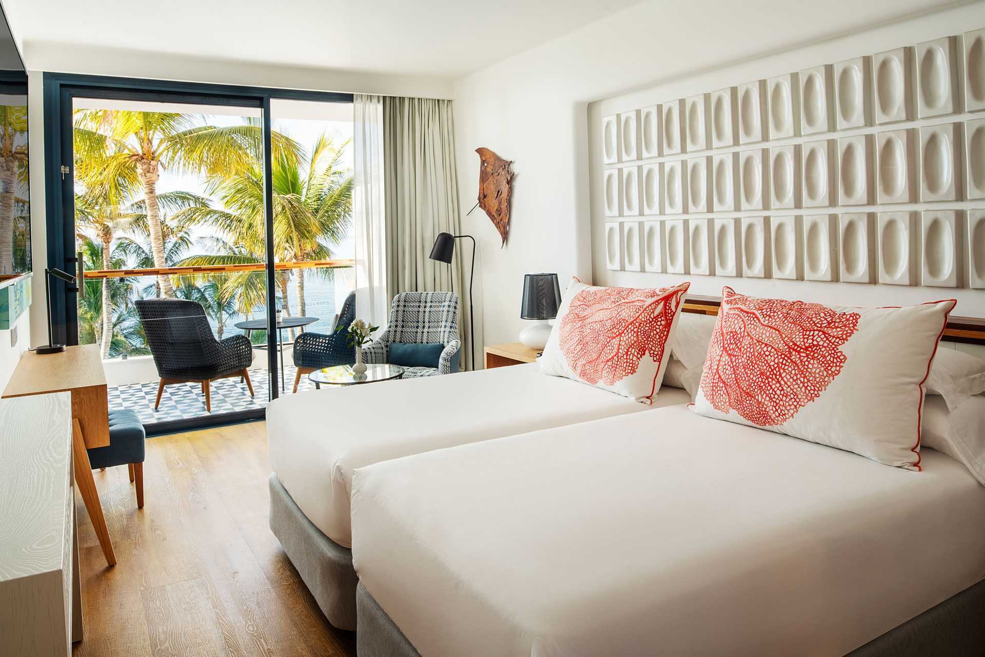 Tweepersoonskamer met balkon en uitzicht op zee. Twee éénpersoonsbedden. Kussenmenu. Wifi, airconditioning en kluisje inbegrepen. Koelkast. Waterkoker en koffie- en theefaciliteiten. TV met internationale zenders. Badjassen en slippers. Föhn. Badkamer met douche en toilet. Schoonmaak 7 keer per week.
