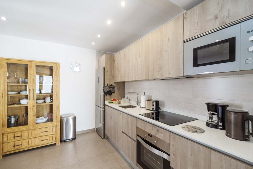 Oven, kookplaat, magnetron, vriezer, koelkast, koel-vriescombinatie, vaatwasser, deuren naar terras