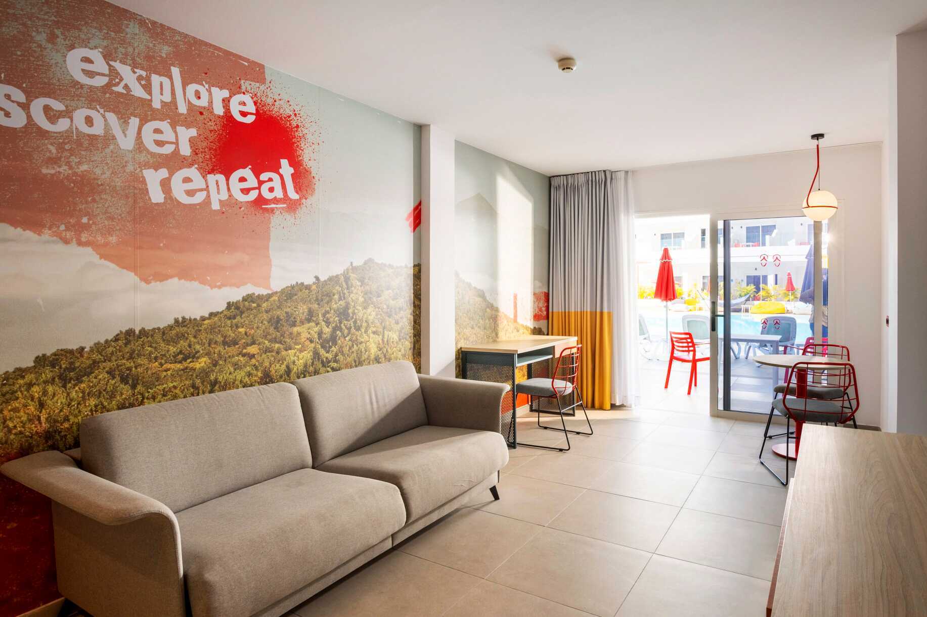 Suite met balkon en uitzicht op het zwembad. De suite bestaat uit een slaapkamer en een woonkamer. Twee eenpersoonsbedden. Mogelijkheid voor extra bed in slaapbank. Wifi, airconditioning en kluis inbegrepen. Plafondventilator. Minibar. Tv met internationale zenders. Badkamer met douche en toilet. Schoonmaak om de drie dagen.