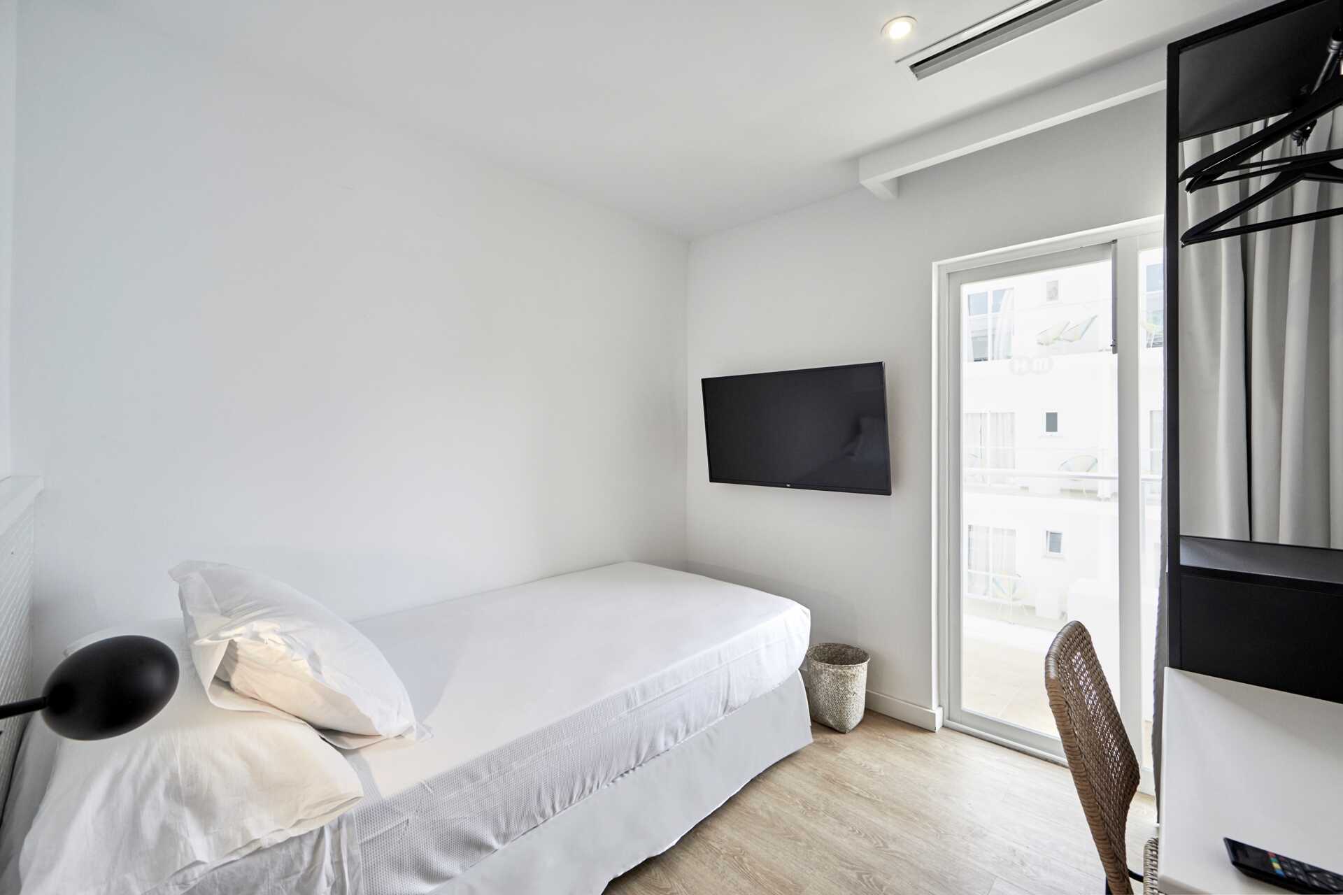 Eenpersoonskamer met balkon. Een eenpersoonsbed. Wifi en airconditioning inbegrepen. Kluisje tegen betaling. Koelkast. Tv met internationale zenders. Föhn. Badkamer met douche en toilet. Schoonmaak 7 keer/week.