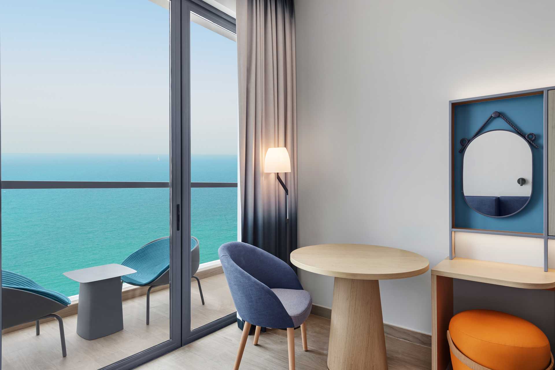 Deluxe kamer met balkon en zeezicht. De kamers bevinden zich hoog in het gebouw. Een tweepersoonsbed of twee eenpersoonsbedden. Mogelijkheid tot een extra bed in de vorm van een slaapbank, of de al aanwezige bedden. Wifi, airconditioning en kluisje inbegrepen. Koelkast. Tv met internationale zenders. Strijkijzer en strijkplank. Föhn. Badkamer met douche en toilet. Schoonmaak 7 keer/week.
